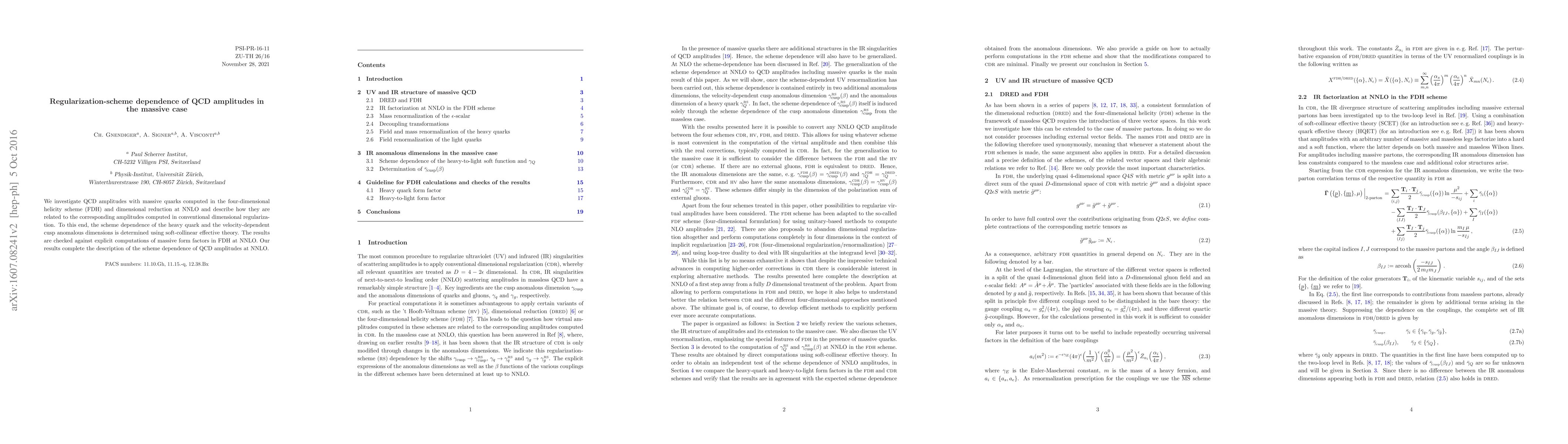 This paper examines the dependence of QCD amplitudes with massive quarks on regularization schemes, specifically comparing results from the four-dimensional helicity scheme to those from conventional dimensional regularization at next-to-next-to-leading order. The study uses soft-collinear effective theory to determine scheme-dependent anomalous dimensions and validates findings through explicit computations of massive form factors.