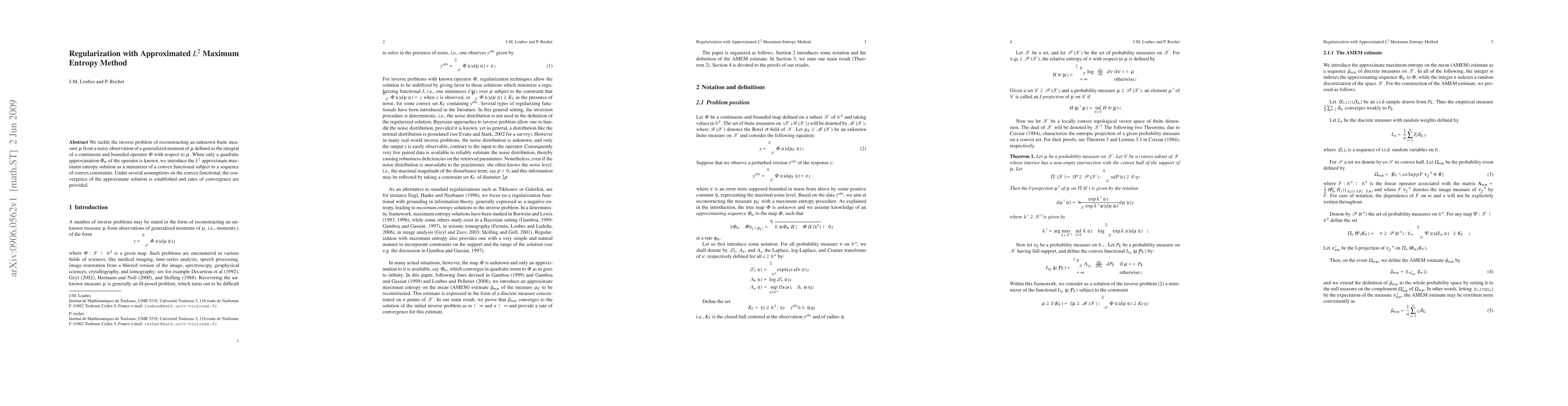 This paper introduces a method to reconstruct an unknown measure from noisy observations using a quadratic approximation of a continuous operator. It establishes the convergence and rate of convergence of the approximate solution under certain assumptions.