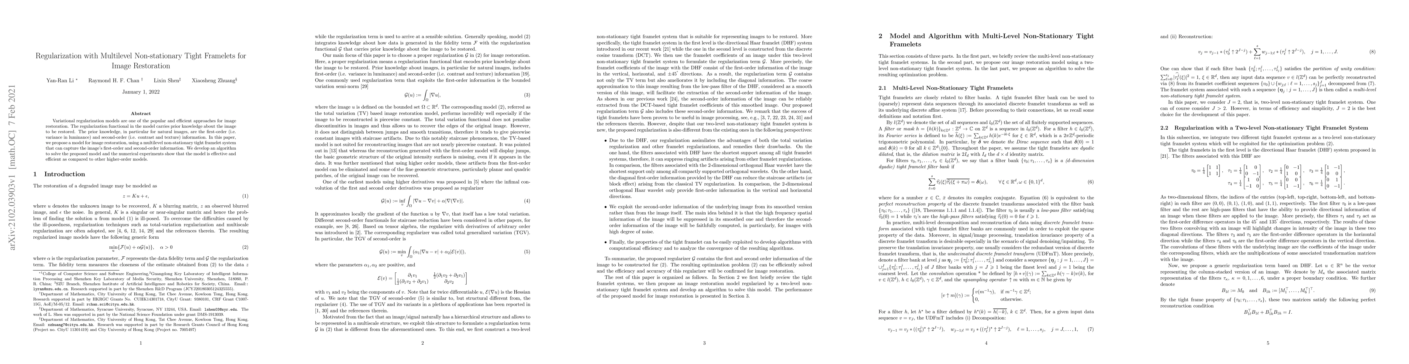 This paper proposes a variational regularization model for image restoration using a multilevel non-stationary tight framelet system to capture first-order and second-order image information. The developed algorithm demonstrates effectiveness and efficiency in numerical experiments compared to higher-order models.