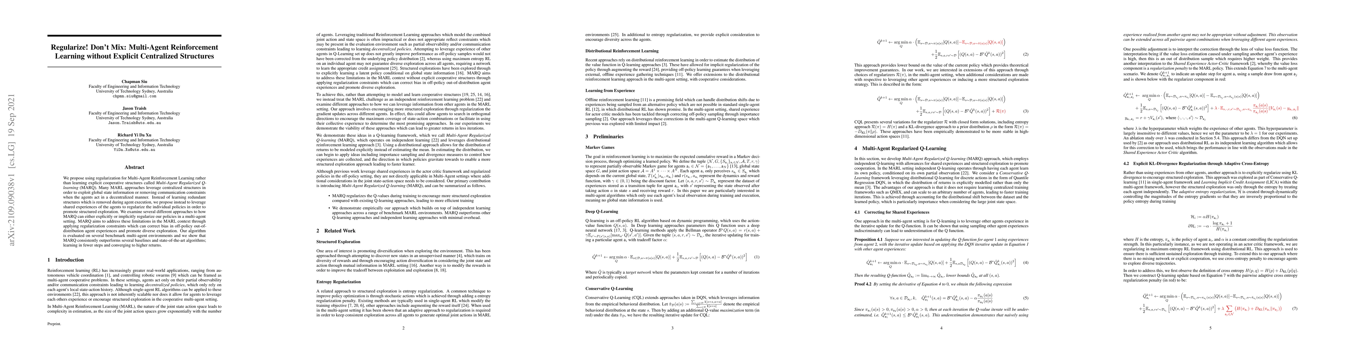 We propose using regularization for Multi-Agent Reinforcement Learning rather than learning explicit cooperative structures called {\em Multi-Agent Regularized Q-learning} (MARQ). Many MARL approaches leverage centralized structures in order to exploit global state information or removing communication constraints when the agents act in a decentralized manner. Instead of learning redundant structures which is removed during agent execution, we propose instead to leverage shared experiences of the agents to regularize the individual policies in order to promote structured exploration. We examine several different approaches to how MARQ can either explicitly or implicitly regularize our policies in a multi-agent setting. MARQ aims to address these limitations in the MARL context through applying regularization constraints which can correct bias in off-policy out-of-distribution agent experiences and promote diverse exploration. Our algorithm is evaluated on several benchmark multi-agent environments and we show that MARQ consistently outperforms several baselines and state-of-the-art algorithms; learning in fewer steps and converging to higher returns.