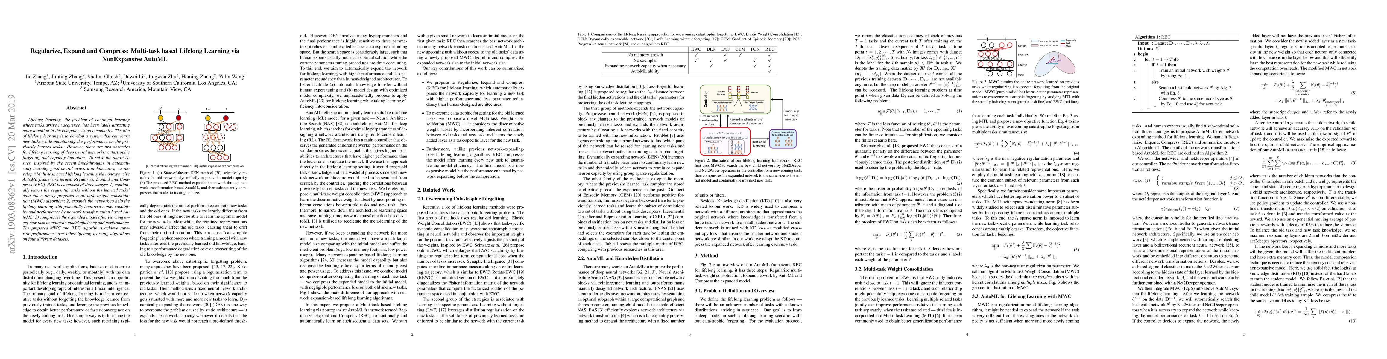 This paper proposes a Multi-task based lifelong learning framework called Regularize, Expand and Compress (REC) to address catastrophic forgetting and capacity limitation in deep neural networks. REC employs a multi-task weight consolidation algorithm, network-transformation based AutoML for expansion, and model compression to maintain performance on previously learned tasks while learning new ones.
