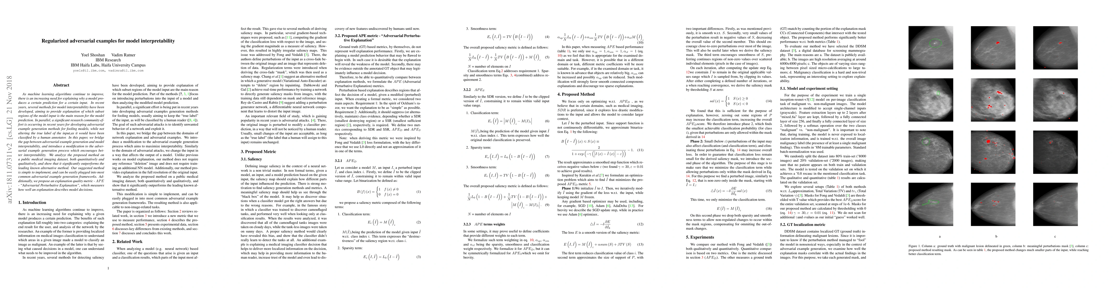 As machine learning algorithms continue to improve, there is an increasing need for explaining why a model produces a certain prediction for a certain input. In recent years, several methods for model interpretability have been developed, aiming to provide explanation of which subset regions of the model input is the main reason for the model prediction. In parallel, a significant research community effort is occurring in recent years for developing adversarial example generation methods for fooling models, while not altering the true label of the input,as it would have been classified by a human annotator. In this paper, we bridge the gap between adversarial example generation and model interpretability, and introduce a modification to the adversarial example generation process which encourages better interpretability. We analyze the proposed method on a public medical imaging dataset, both quantitatively and qualitatively, and show that it significantly outperforms the leading known alternative method. Our suggested method is simple to implement, and can be easily plugged into most common adversarial example generation frameworks. Additionally, we propose an explanation quality metric - $APE$ - "Adversarial Perturbative Explanation", which measures how well an explanation describes model decisions.