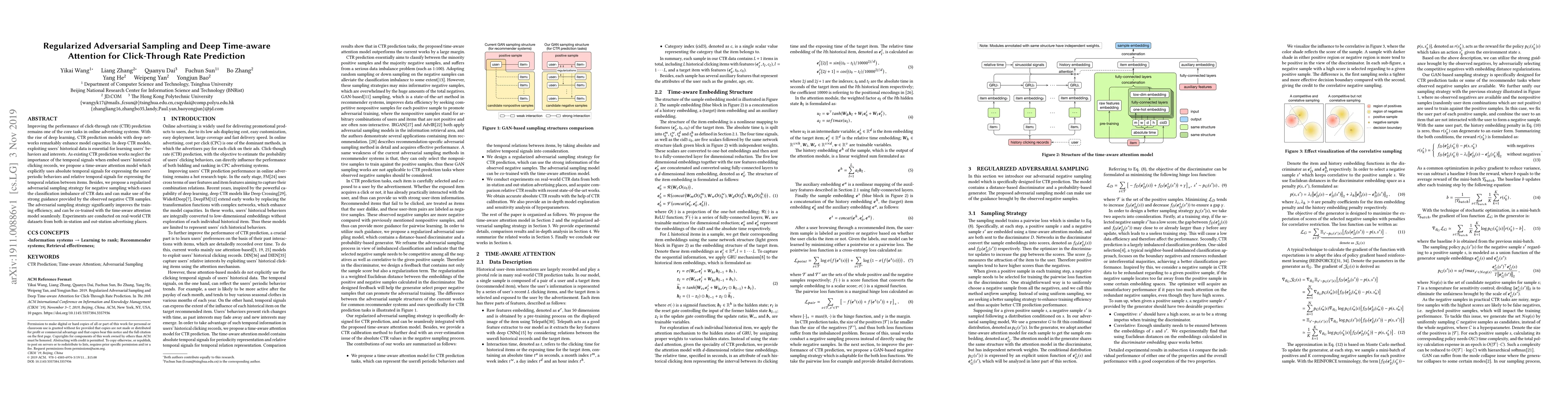 This paper proposes a time-aware attention model and a regularized adversarial sampling strategy to enhance click-through rate prediction. The time-aware attention model uses temporal signals to capture users' periodic behaviors and item relations, while the adversarial sampling strategy addresses classification imbalance, improving training efficiency and model performance.