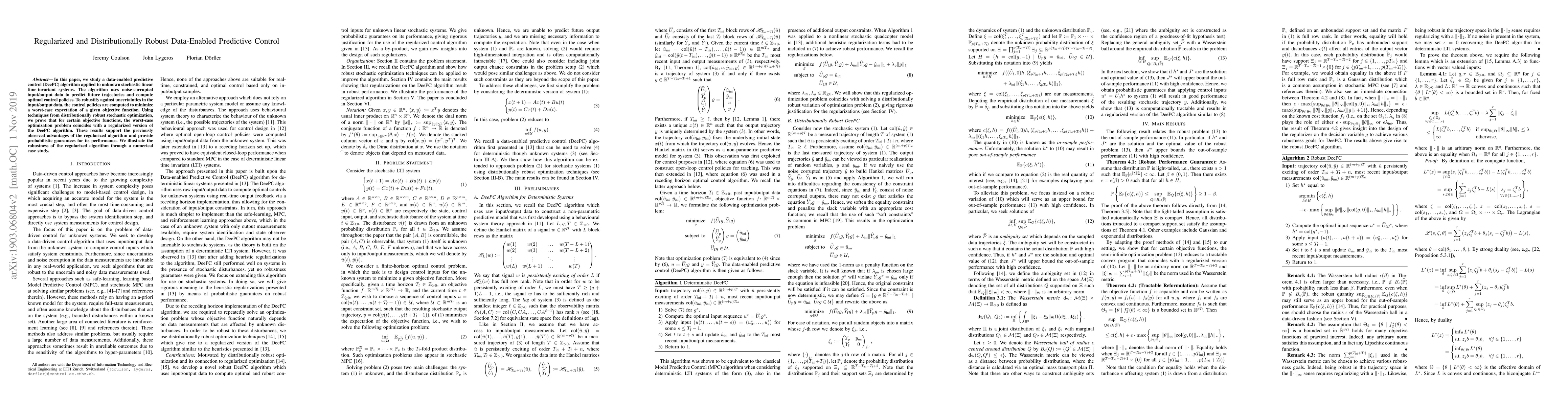 In this paper, we study a data-enabled predictive control (DeePC) algorithm applied to unknown stochastic linear time-invariant systems. The algorithm uses noise-corrupted input/output data to predict future trajectories and compute optimal control policies. To robustify against uncertainties in the input/output data, the control policies are computed to minimize a worst-case expectation of a given objective function. Using techniques from distributionally robust stochastic optimization, we prove that for certain objective functions, the worst-case optimization problem coincides with a regularized version of the DeePC algorithm. These results support the previously observed advantages of the regularized algorithm and provide probabilistic guarantees for its performance. We illustrate the robustness of the regularized algorithm through a numerical case study.