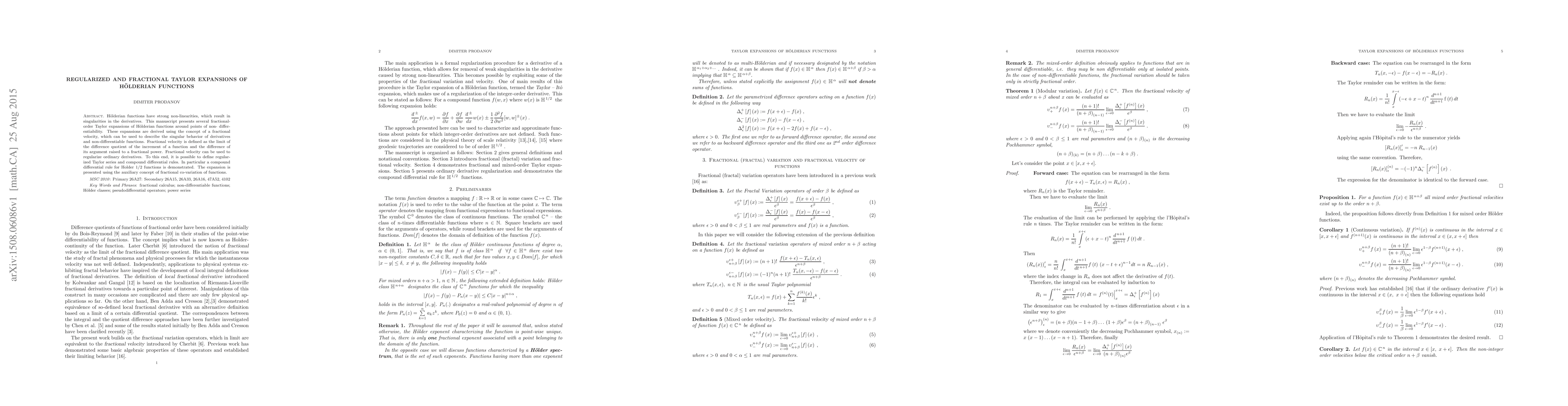 Holderian functions have strong non-linearities, which result in singularities in the derivatives. This manuscript presents several fractional-order Taylor expansions of H\"olderian functions around points of non- differentiability. These expansions are derived using the concept of a fractional velocity, which can be used to describe the singular behavior of derivatives and non-differentiable functions. Fractional velocity is defined as the limit of the difference quotient of the increment of a function and the difference of its argument raised to a fractional power. Fractional velocity can be used to regularize ordinary derivatives. To this end, it is possible to define regularized Taylor series and compound differential rules. In particular a compound differential rule for Holder 1/2 functions is demonstrated. The expansion is presented using the auxiliary concept of fractional co-variation of functions.