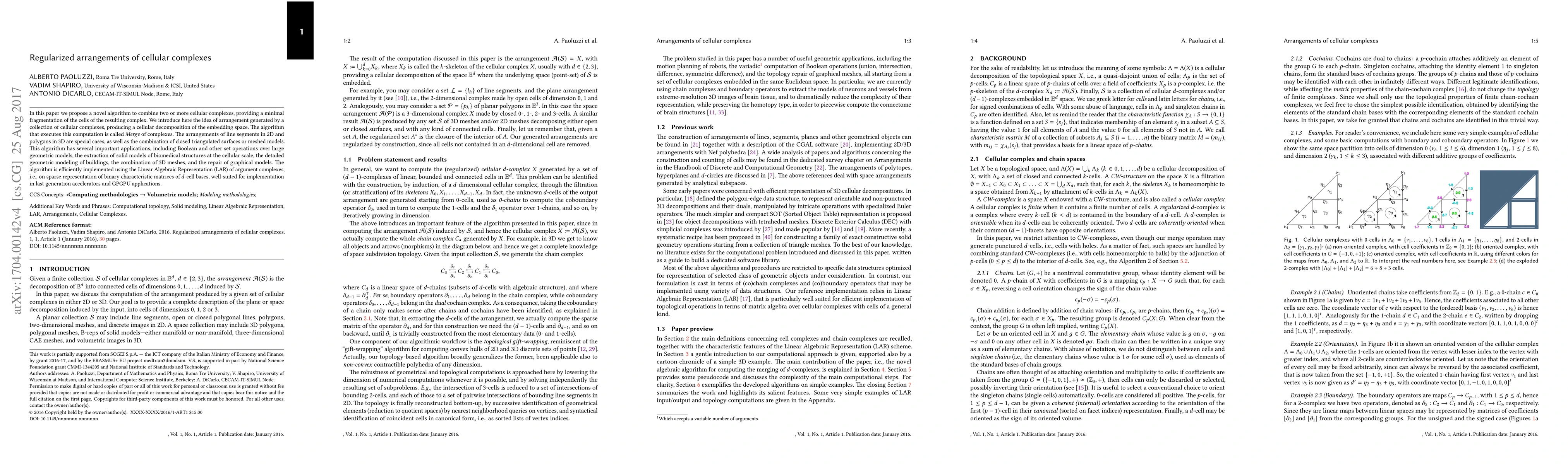 In this paper we propose a novel algorithm to combine two or more cellular complexes, providing a minimal fragmentation of the cells of the resulting complex. We introduce here the idea of arrangement generated by a collection of cellular complexes, producing a cellular decomposition of the embedding space. The algorithm that executes this computation is called \emph{Merge} of complexes. The arrangements of line segments in 2D and polygons in 3D are special cases, as well as the combination of closed triangulated surfaces or meshed models. This algorithm has several important applications, including Boolean and other set operations over large geometric models, the extraction of solid models of biomedical structures at the cellular scale, the detailed geometric modeling of buildings, the combination of 3D meshes, and the repair of graphical models. The algorithm is efficiently implemented using the Linear Algebraic Representation (LAR) of argument complexes, i.e., on sparse representation of binary characteristic matrices of $d$-cell bases, well-suited for implementation in last generation accelerators and GPGPU applications.