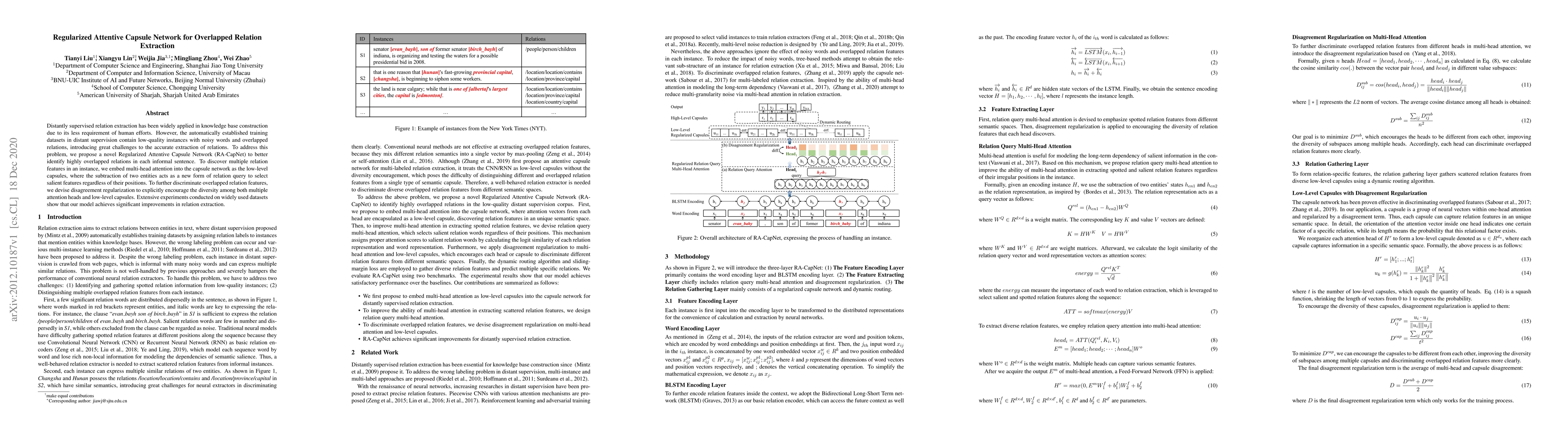 A new model called Regularized Attentive Capsule Network improves relation extraction accuracy by addressing noisy words and overlapped relations in training datasets. It achieves significant improvements on widely used datasets.
