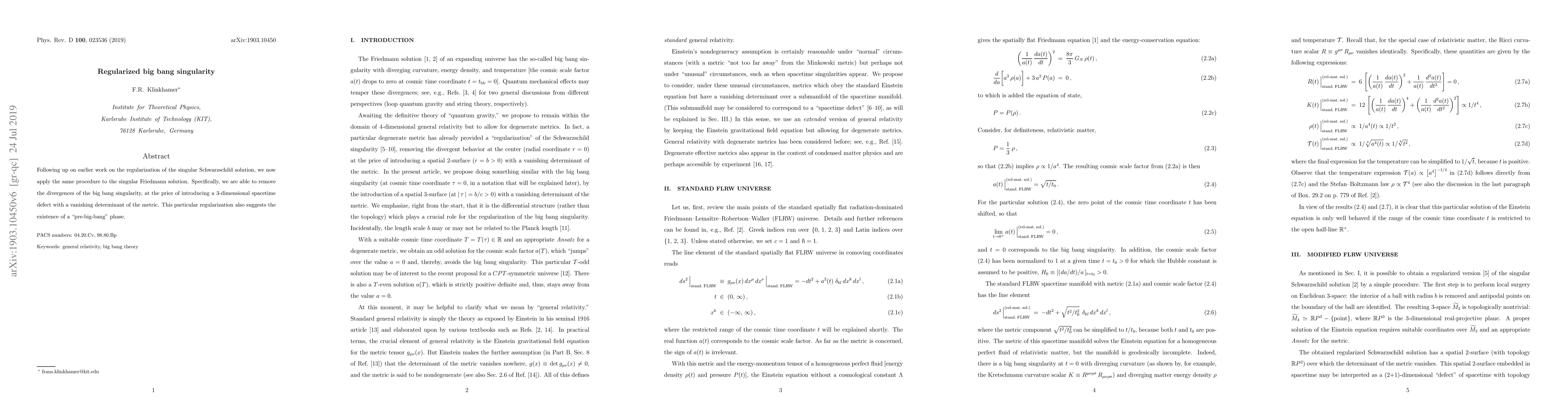 This paper regularizes the big bang singularity by applying a method similar to that used for the Schwarzschild solution, resulting in the removal of divergences but introducing a 3-dimensional spacetime defect. The regularization also hints at a possible "pre-big-bang" phase.