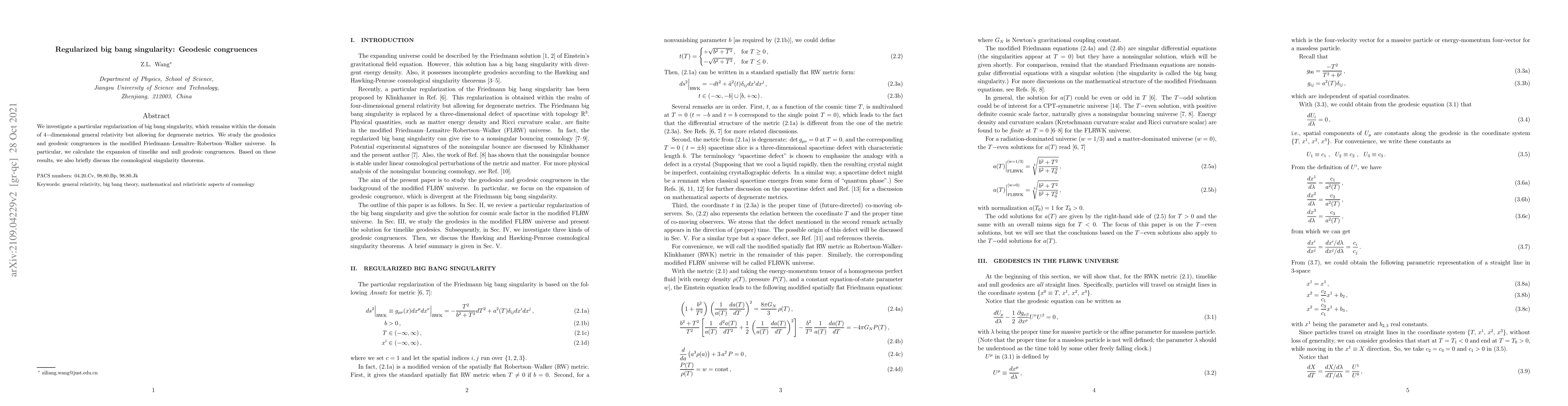This paper explores a regularization of the big bang singularity within 4-dimensional general relativity, focusing on degenerate metrics. It examines geodesics and congruences in a modified Friedmann-Lemaître-Robertson-Walker universe, calculating the expansion of timelike and null geodesics, and discusses implications for cosmological singularity theorems.