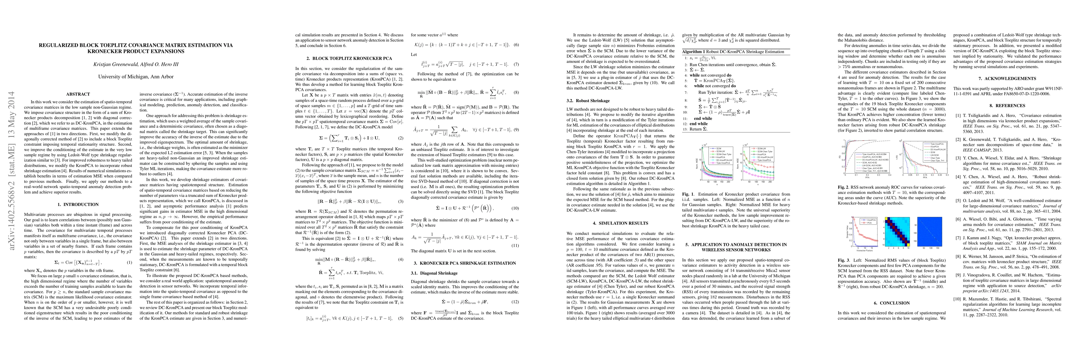 This paper proposes a modified Kronecker product decomposition method, called DC-KronPCA, for estimating spatio-temporal covariance matrices under low sample sizes and non-Gaussian conditions. It incorporates block Toeplitz constraints and shrinkage regularization to improve estimation accuracy and robustness, achieving superior performance in anomaly detection tasks compared to existing methods.