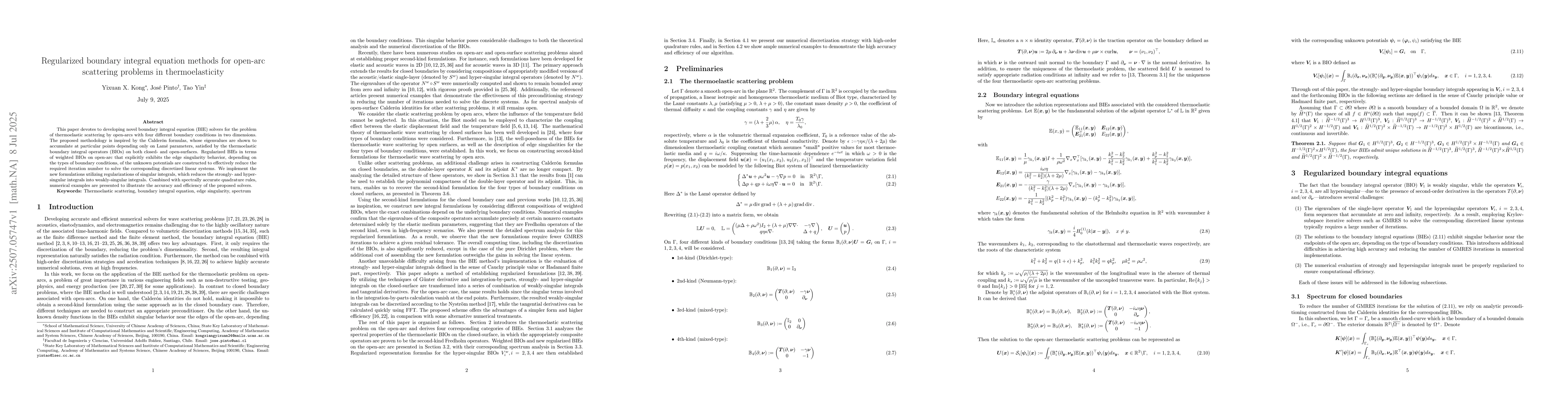 This paper devotes to developing novel boundary integral equation (BIE) solvers for the problem of thermoelastic scattering by open-arcs with four different boundary conditions in two dimensions. The proposed methodology is inspired by the Calder\'on formulas, whose eigenvalues are shown to accumulate at particular points depending only on Lam\'e parameters, satisfied by the thermoelastic boundary integral operators (BIOs) on both closed- and open-surfaces. Regularized BIEs in terms of weighted BIOs on open-arc that explicitly exhibits the edge singularity behavior, depending on the types of boundary conditions, of the unknown potentials are constructed to effectively reduce the required iteration number to solve the corresponding discretized linear systems. We implement the new formulations utilizing regularizations of singular integrals, which reduces the strongly- and hyper-singular integrals into weakly-singular integrals. Combined with spectrally accurate quadrature rules, numerical examples are presented to illustrate the accuracy and efficiency of the proposed solvers.