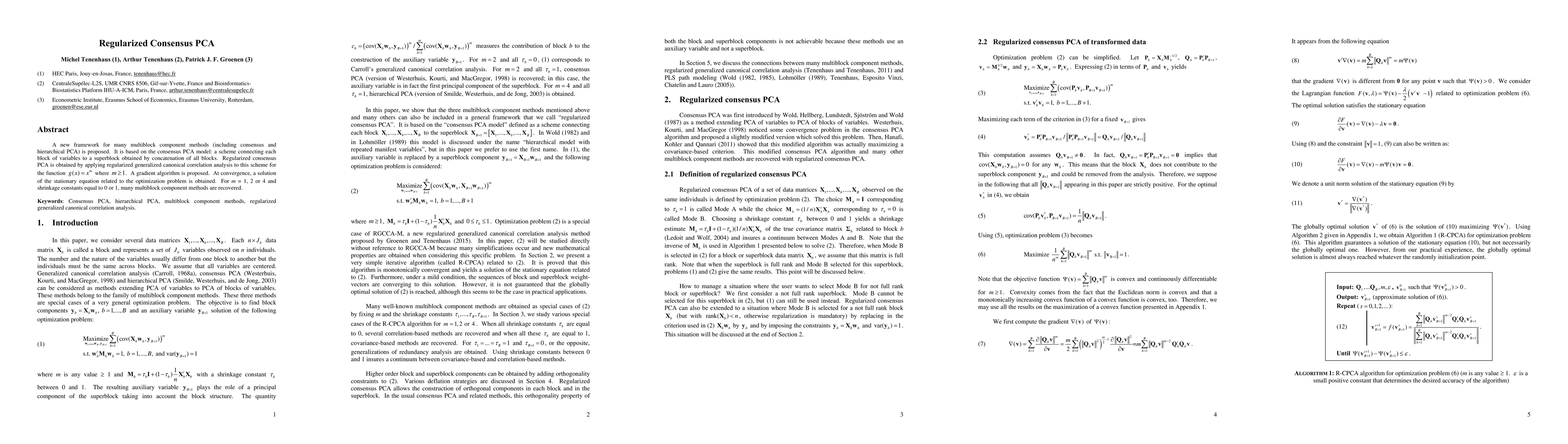 Regularized Consensus PCA proposes a new framework for multiblock component methods using regularized generalized canonical correlation analysis, recovering known methods with specified parameter values.
