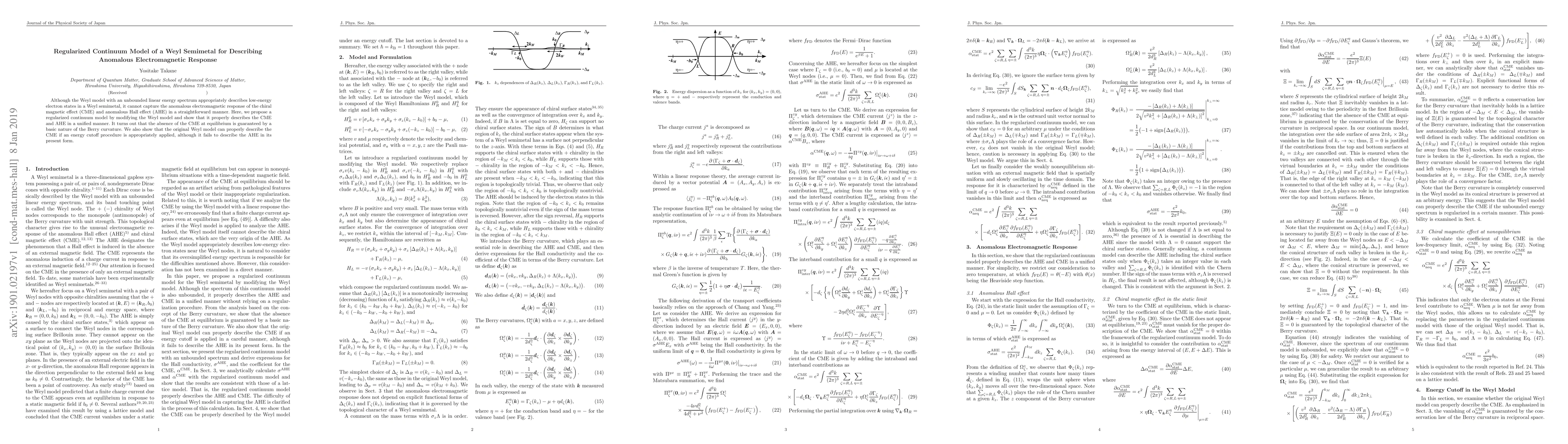 This paper proposes a regularized continuum model to describe the anomalous electromagnetic response of Weyl semimetals, including the chiral magnetic effect and anomalous Hall effect. The modified model captures these phenomena more accurately than the original Weyl model, which requires an energy cutoff for the CME but fails to describe the AHE.