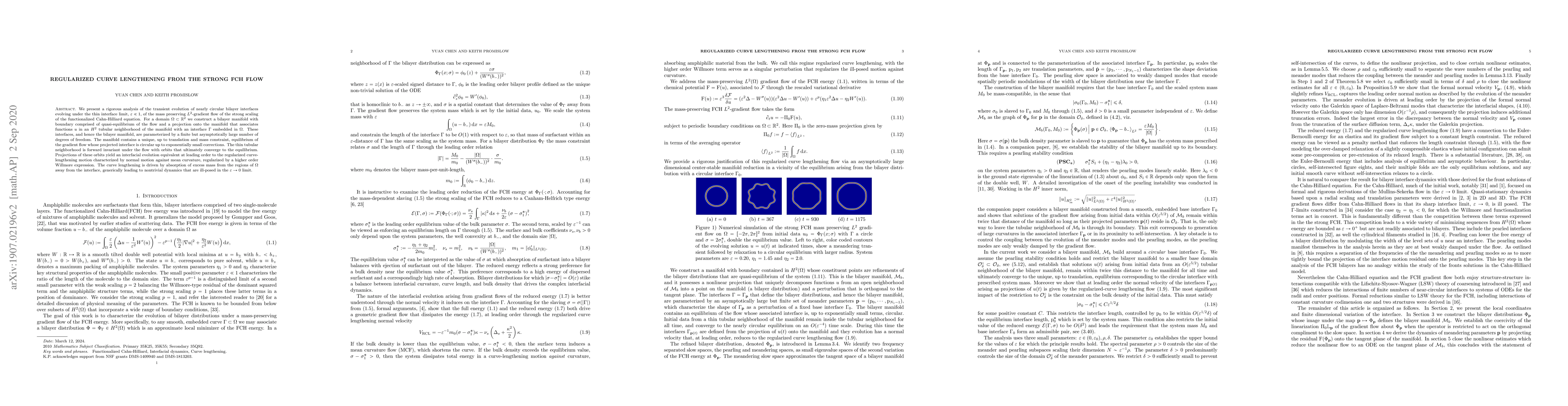 We present a rigorous analysis of the transient evolution of nearly circular bilayer interfaces evolving under the thin interface limit, $\varepsilon\ll1$, of the mass preserving $L^2$-gradient flow of the strong scaling of the functionalized Cahn-Hilliard equation. For a domain $\Omega\subset{\mathbb R}^2$ we construct a bilayer manifold with boundary comprised of quasi-equilibrium of the flow and a projection onto the manifold that associates functions $u$ in an $H^2$ tubular neighborhood of the manifold with an interface $\Gamma$ embedded in $\Omega$. These interfaces, and hence the bilayer manifold, are parameterized by a finite but asymptotically large number of degrees of freedom. The manifold contains a unique, up to translation and mass constraint, equilibrium of the gradient flow whose projected interface is circular up to exponentially small corrections. The thin tubular neighborhood is forward invariant under the flow with orbits that ultimately converge to the equilibrium. Projections of these orbits yield an interfacial evolution equivalent at leading order to the regularized curve-lengthening motion characterized by normal motion {\sl against} mean curvature, regularized by a higher order Willmore expression. The curve lengthening is driven by absorption of excess mass from the regions of $\Omega$ away from the interface, generically leading to nontrivial dynamics that are ill-posed in the $\varepsilon\to0$ limit.
