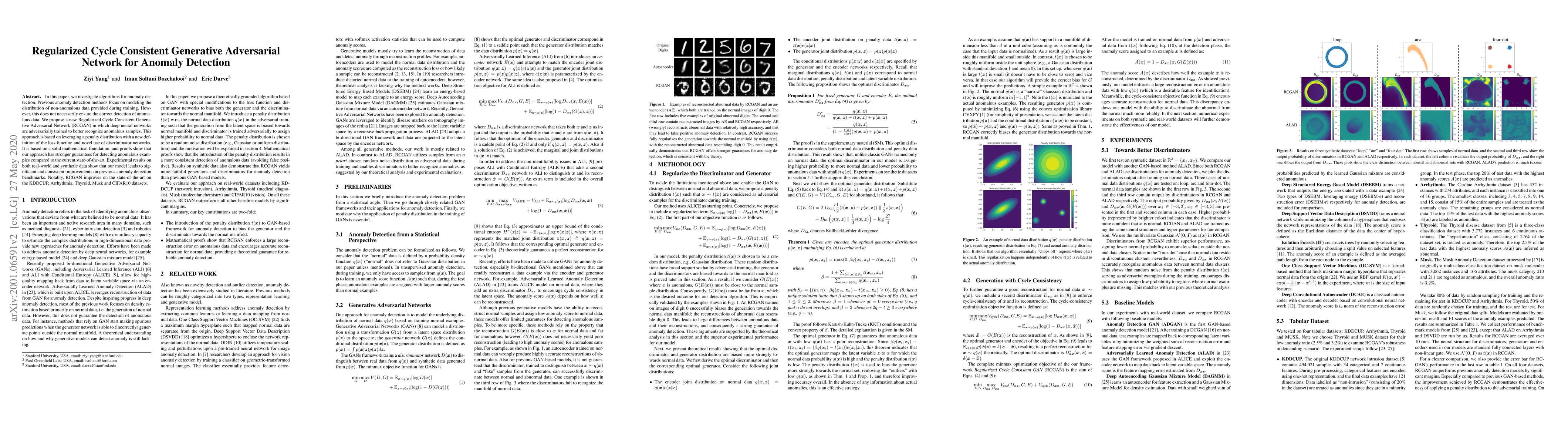 This paper proposes a Regularized Cycle Consistent Generative Adversarial Network (RCGAN) for anomaly detection, leveraging a novel loss function and discriminator networks to better identify anomalous samples. Experimental results show significant improvements over existing methods on multiple datasets.