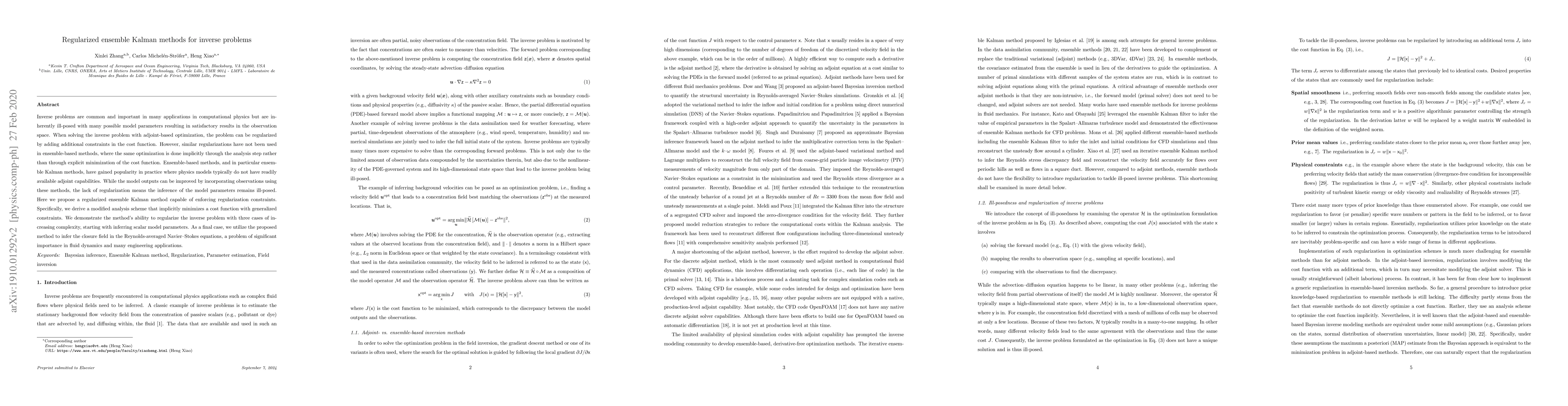 This paper proposes a regularized ensemble Kalman method to address the ill-posedness of inverse problems in computational physics. The method introduces regularization implicitly through a modified analysis scheme, demonstrating its effectiveness in inferring model parameters and closure fields in fluid dynamics applications.