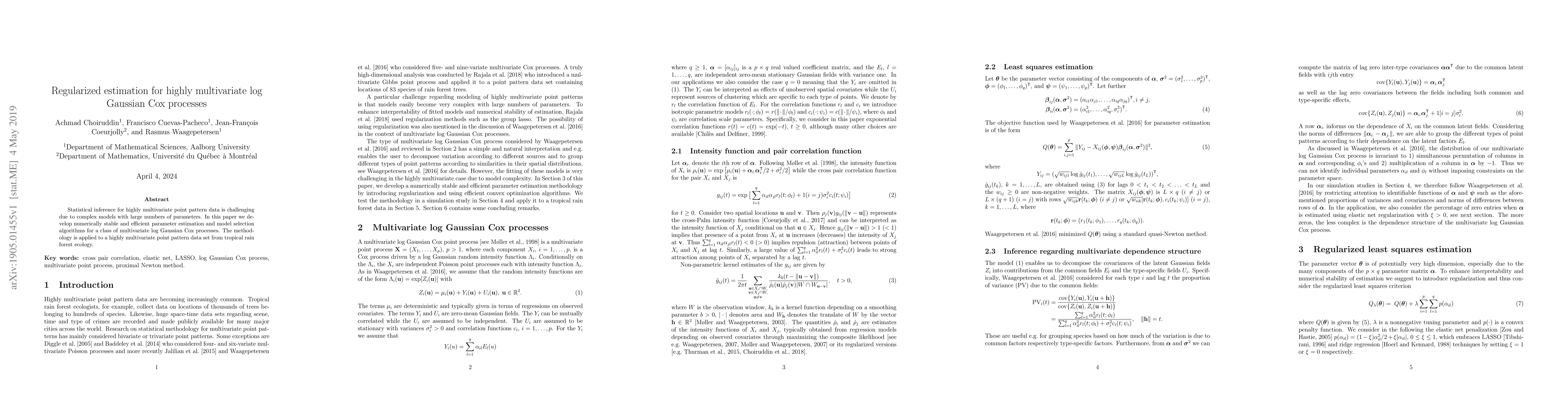 This paper presents stable and efficient algorithms for estimating parameters and selecting models for multivariate log Gaussian Cox processes, addressing the challenges of complex models with many parameters, and applies the methodology to a tropical rain forest ecology dataset.