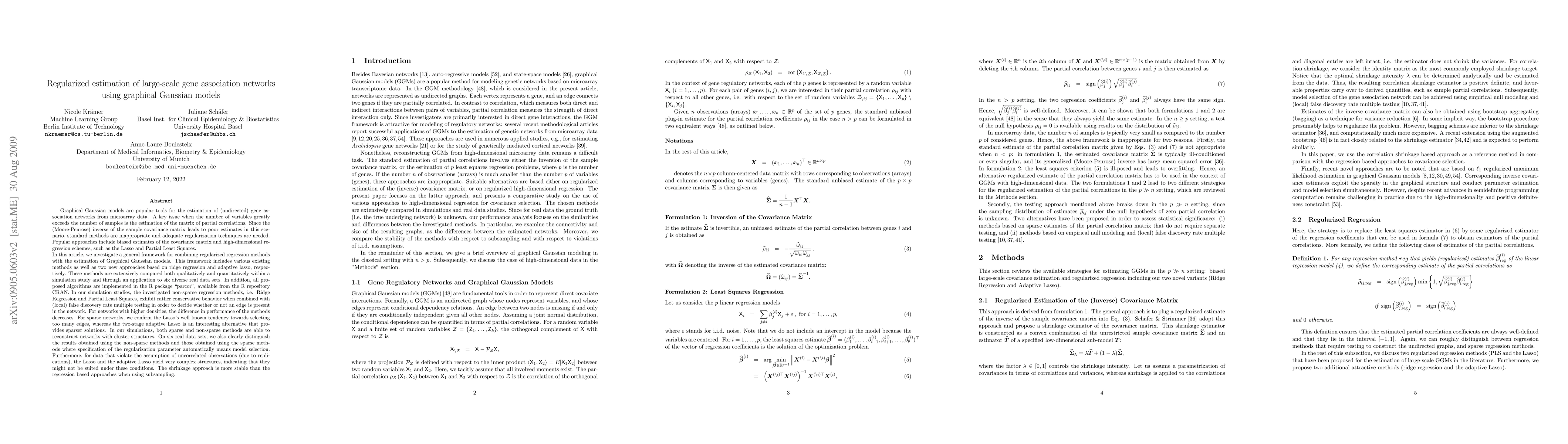 Graphical Gaussian models are popular tools for the estimation of (undirected) gene association networks from microarray data. A key issue when the number of variables greatly exceeds the number of samples is the estimation of the matrix of partial correlations. Since the (Moore-Penrose) inverse of the sample covariance matrix leads to poor estimates in this scenario, standard methods are inappropriate and adequate regularization techniques are needed. In this article, we investigate a general framework for combining regularized regression methods with the estimation of Graphical Gaussian models. This framework includes various existing methods as well as two new approaches based on ridge regression and adaptive lasso, respectively. These methods are extensively compared both qualitatively and quantitatively within a simulation study and through an application to six diverse real data sets. In addition, all proposed algorithms are implemented in the R package "parcor", available from the R repository CRAN.