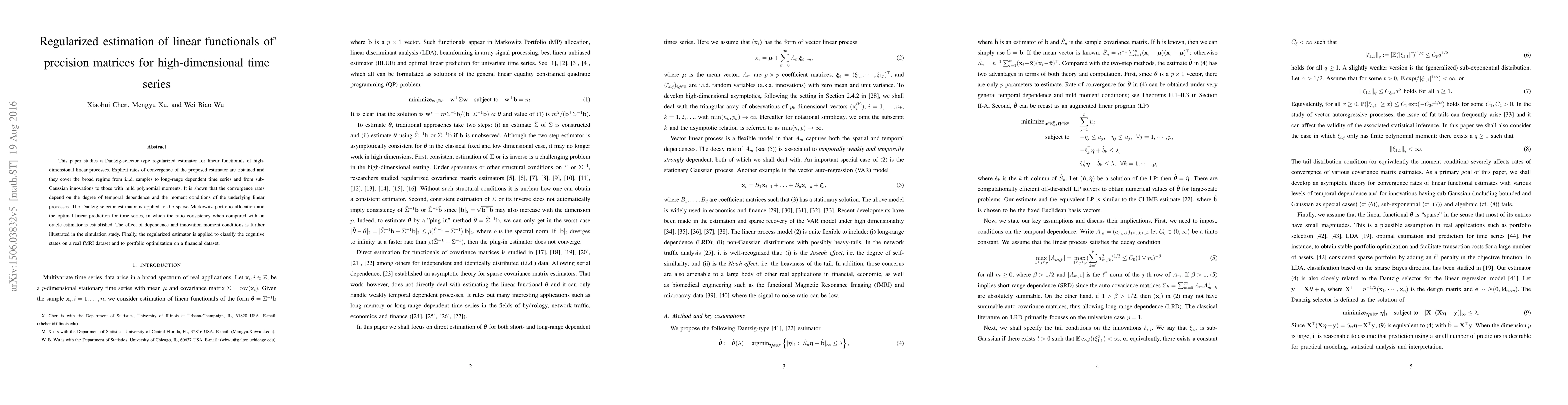 This paper studies a Dantzig-selector type regularized estimator for linear functionals of high-dimensional linear processes. Explicit rates of convergence of the proposed estimator are obtained and they cover the broad regime from i.i.d. samples to long-range dependent time series and from sub-Gaussian innovations to those with mild polynomial moments. It is shown that the convergence rates depend on the degree of temporal dependence and the moment conditions of the underlying linear processes. The Dantzig-selector estimator is applied to the sparse Markowitz portfolio allocation and the optimal linear prediction for time series, in which the ratio consistency when compared with an oracle estimator is established. The effect of dependence and innovation moment conditions is further illustrated in the simulation study. Finally, the regularized estimator is applied to classify the cognitive states on a real fMRI dataset and to portfolio optimization on a financial dataset.