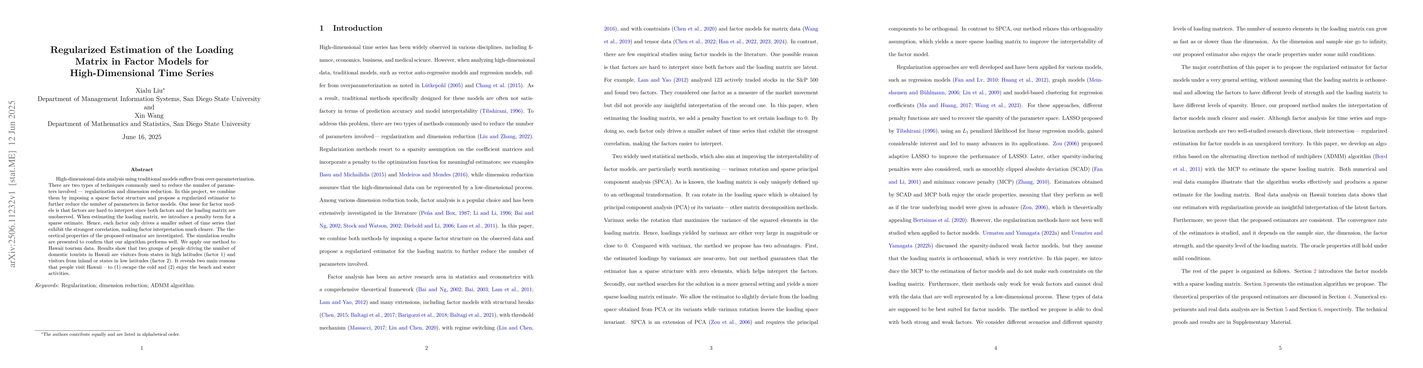 High-dimensional data analysis using traditional models suffers from overparameterization. Two types of techniques are commonly used to reduce the number of parameters - regularization and dimension reduction. In this project, we combine them by imposing a sparse factor structure and propose a regularized estimator to further reduce the number of parameters in factor models. A challenge limiting the widespread application of factor models is that factors are hard to interpret, as both factors and the loading matrix are unobserved. To address this, we introduce a penalty term when estimating the loading matrix for a sparse estimate. As a result, each factor only drives a smaller subset of time series that exhibit the strongest correlation, improving the factor interpretability. The theoretical properties of the proposed estimator are investigated. The simulation results are presented to confirm that our algorithm performs well. We apply our method to Hawaii tourism data. The results indicate that two groups drive the number of domestic tourists in Hawaii: visitors from high-latitude states (factor 1) and visitors from inland or low-latitude states (factor 2). It reveals two main reasons people visit Hawaii: (1) to escape the cold and (2) to enjoy the beach and water activities.