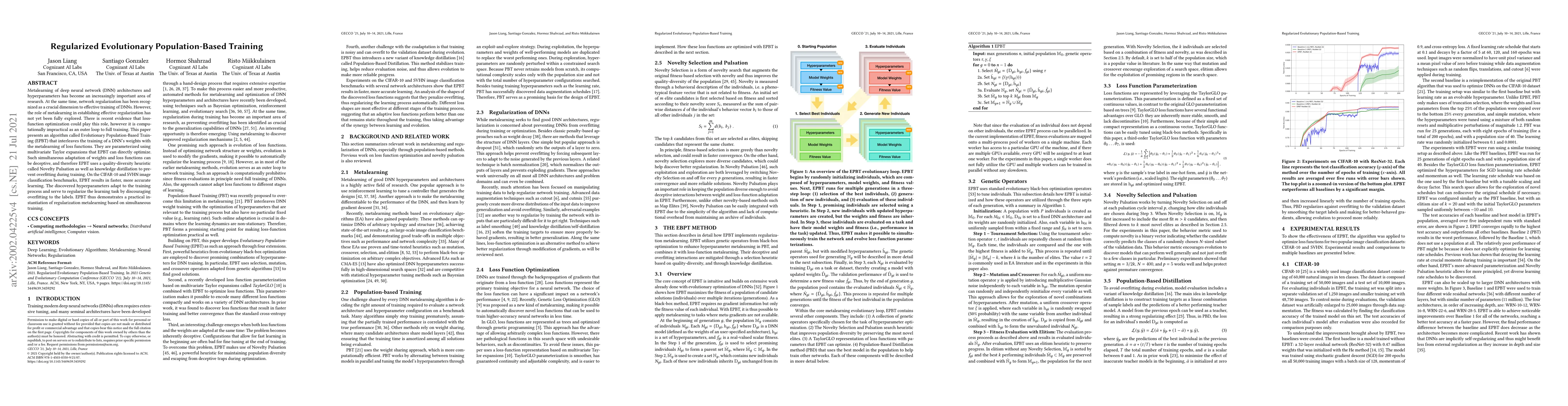 Metalearning of deep neural network (DNN) architectures and hyperparameters has become an increasingly important area of research. At the same time, network regularization has been recognized as a crucial dimension to effective training of DNNs. However, the role of metalearning in establishing effective regularization has not yet been fully explored. There is recent evidence that loss-function optimization could play this role, however it is computationally impractical as an outer loop to full training. This paper presents an algorithm called Evolutionary Population-Based Training (EPBT) that interleaves the training of a DNN's weights with the metalearning of loss functions. They are parameterized using multivariate Taylor expansions that EPBT can directly optimize. Such simultaneous adaptation of weights and loss functions can be deceptive, and therefore EPBT uses a quality-diversity heuristic called Novelty Pulsation as well as knowledge distillation to prevent overfitting during training. On the CIFAR-10 and SVHN image classification benchmarks, EPBT results in faster, more accurate learning. The discovered hyperparameters adapt to the training process and serve to regularize the learning task by discouraging overfitting to the labels. EPBT thus demonstrates a practical instantiation of regularization metalearning based on simultaneous training.
