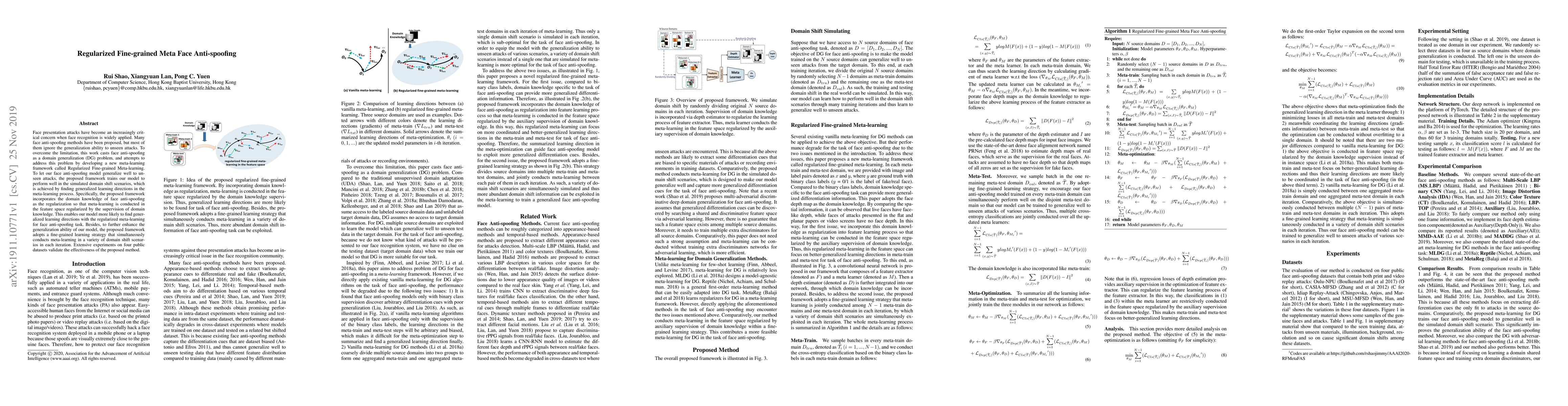 This paper proposes a Regularized Fine-grained Meta-learning framework for face anti-spoofing to enhance generalization to unseen attacks. The method incorporates domain knowledge as regularization and uses a fine-grained learning strategy to improve performance across various domain shift scenarios.
