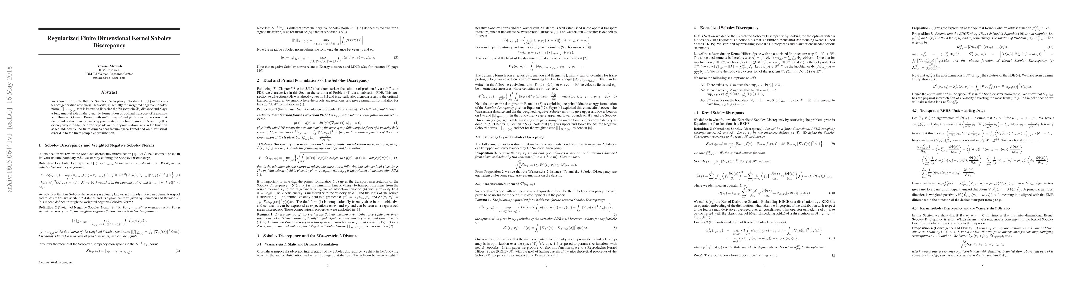 We show in this note that the Sobolev Discrepancy introduced in Mroueh et al in the context of generative adversarial networks, is actually the weighted negative Sobolev norm $||.||_{\dot{H}^{-1}(\nu_q)}$, that is known to linearize the Wasserstein $W_2$ distance and plays a fundamental role in the dynamic formulation of optimal transport of Benamou and Brenier. Given a Kernel with finite dimensional feature map we show that the Sobolev discrepancy can be approximated from finite samples. Assuming this discrepancy is finite, the error depends on the approximation error in the function space induced by the finite dimensional feature space kernel and on a statistical error due to the finite sample approximation.