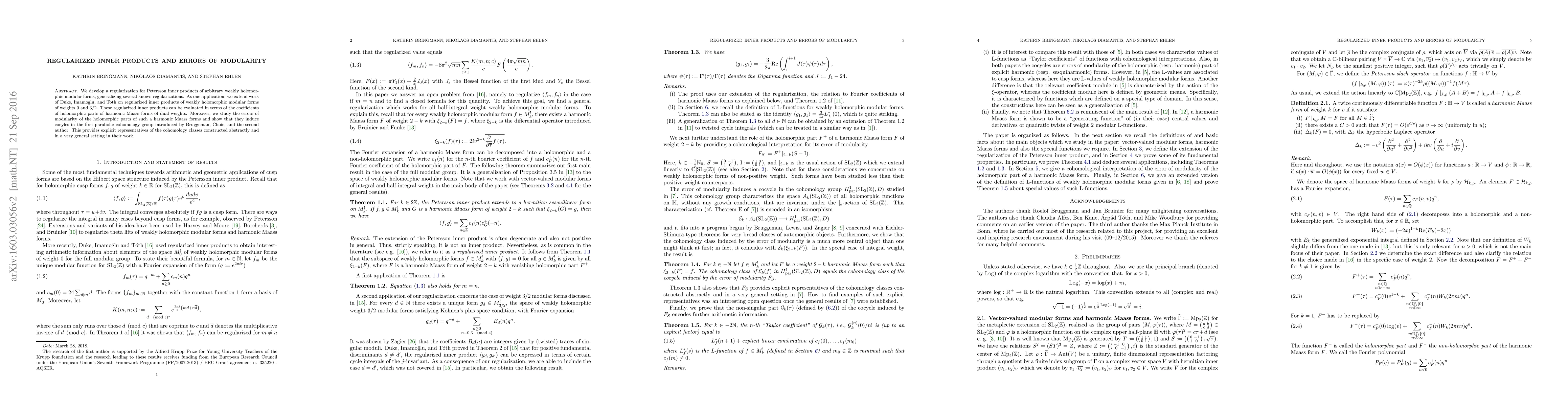 This paper develops a regularization technique for Petersson inner products of weakly holomorphic modular forms, extending previous work by Duke, Imamoglu, and Toth. It also investigates the modularity errors of holomorphic parts of harmonic Maass forms, showing they correspond to cocycles in the first parabolic cohomology group.