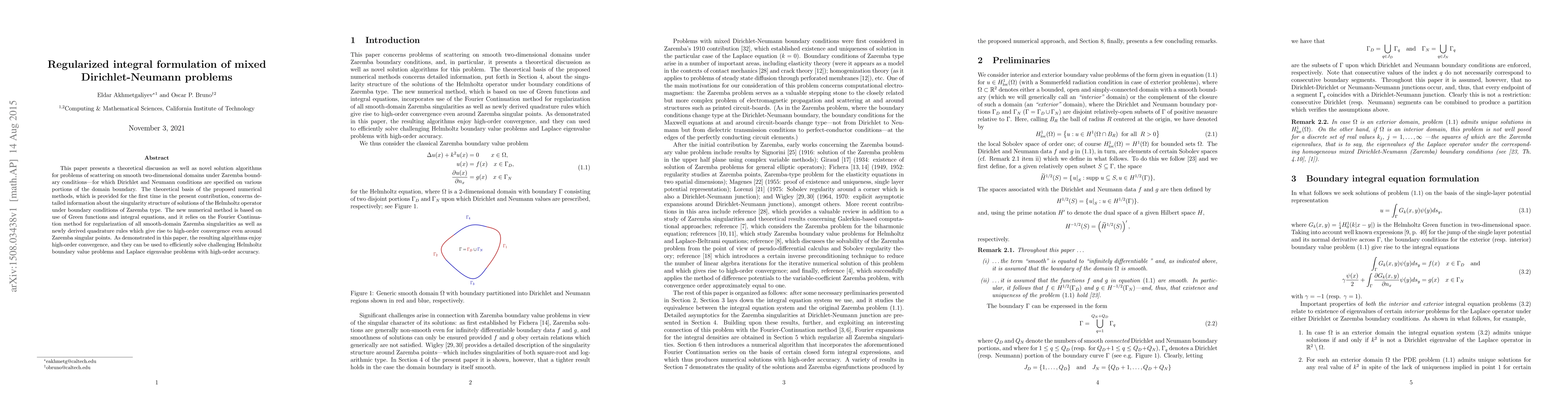 This paper presents a theoretical discussion as well as novel solution algorithms for problems of scattering on smooth two-dimensional domains under Zaremba boundary conditions for which Dirichlet and Neumann conditions are specified on various portions of the domain boundary. The theoretical basis of the proposed numerical methods, which is provided for the first time in the present contribution, concerns detailed information about the singularity structure of solutions of the Helmholtz operator under boundary conditions of Zaremba type. The new numerical method is based on use of Green functions and integral equations, and it relies on the Fourier Continuation method for regularization of all smooth-domain Zaremba singularities as well as newly derived quadrature rules which give rise to high-order convergence even around Zaremba singular points. As demonstrated in this paper, the resulting algorithms enjoy high-order convergence, and they can be used to efficiently solve challenging Helmholtz boundary value problems and Laplace eigenvalue problems with high-order accuracy.