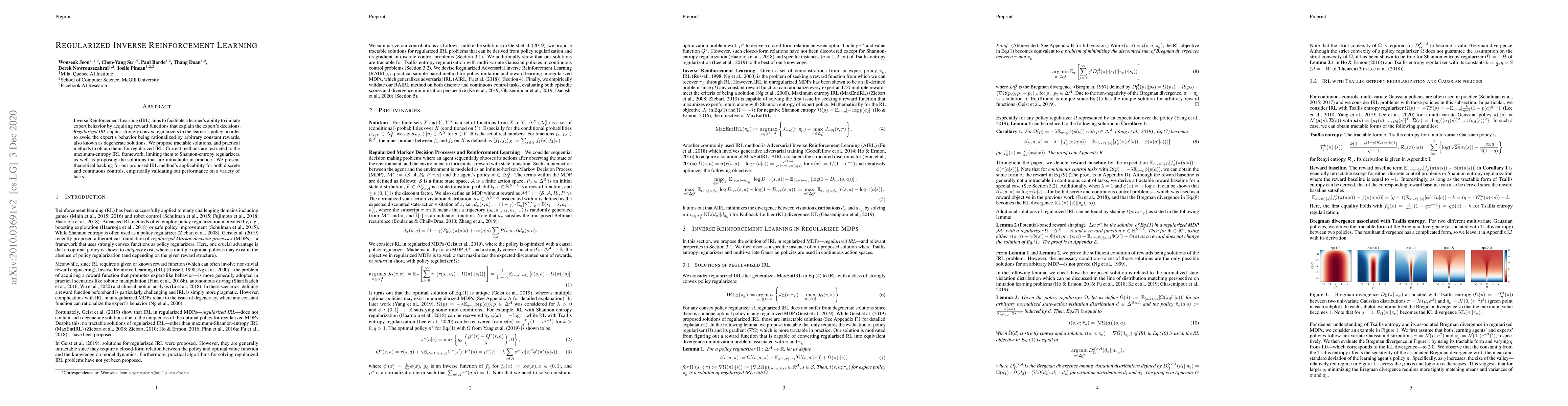This paper proposes a novel approach to regularized Inverse Reinforcement Learning (IRL) that uses strongly convex regularizers to avoid degenerate solutions, offering practical and tractable methods for both discrete and continuous control tasks. The authors provide theoretical justification and empirical validation across various tasks.