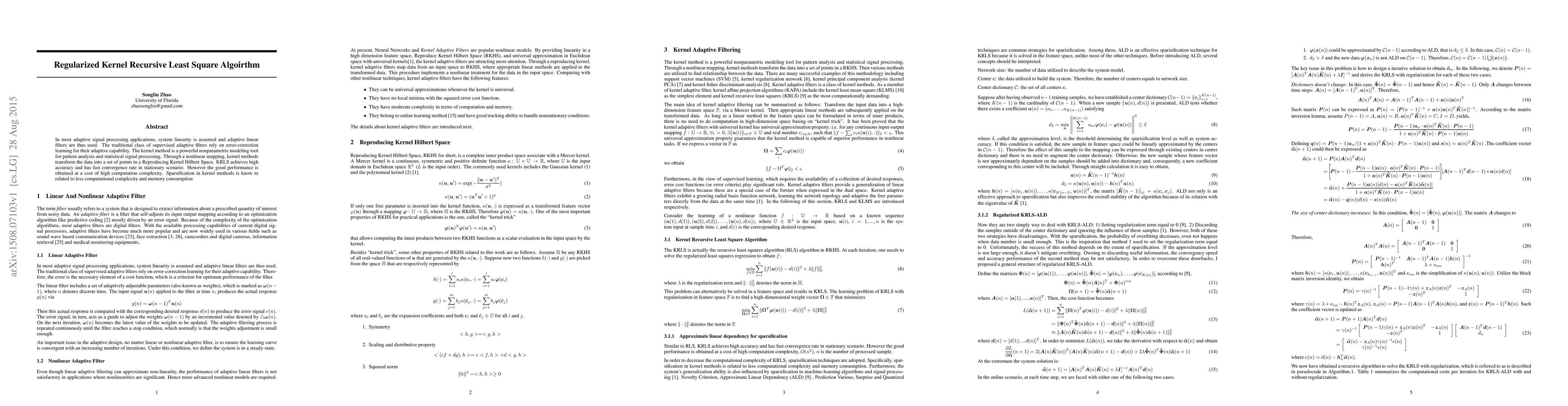 A new algorithm combines kernel methods with recursive least square to improve signal processing accuracy while reducing computational complexity through sparsification.