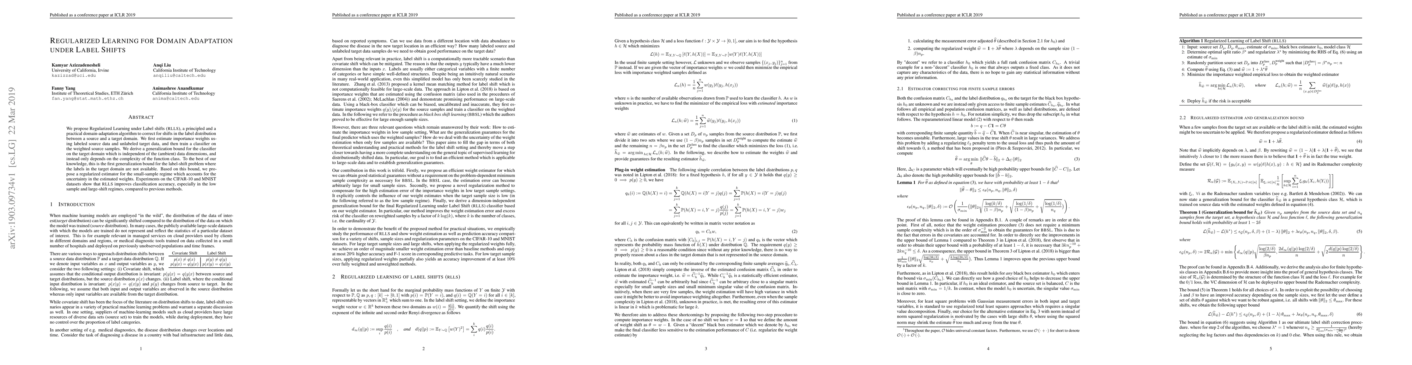 This paper introduces Regularized Learning under Label Shifts (RLLS), a domain adaptation algorithm that corrects for label distribution shifts between source and target domains. It estimates importance weights and trains a classifier on weighted source samples, providing a generalization bound independent of data dimensions. Experiments demonstrate improved accuracy, particularly in low-sample scenarios.