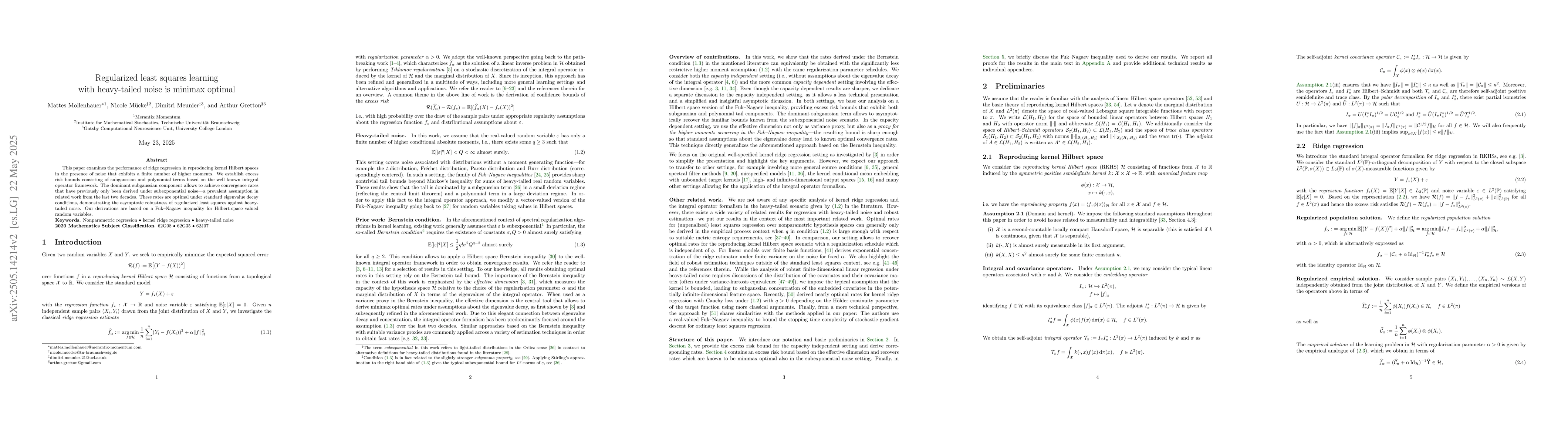 The research extends existing subexponential noise assumptions to heavy-tailed noise with finite moments, providing minimax optimal convergence rates and demonstrating the robustness of regularized least squares methods.