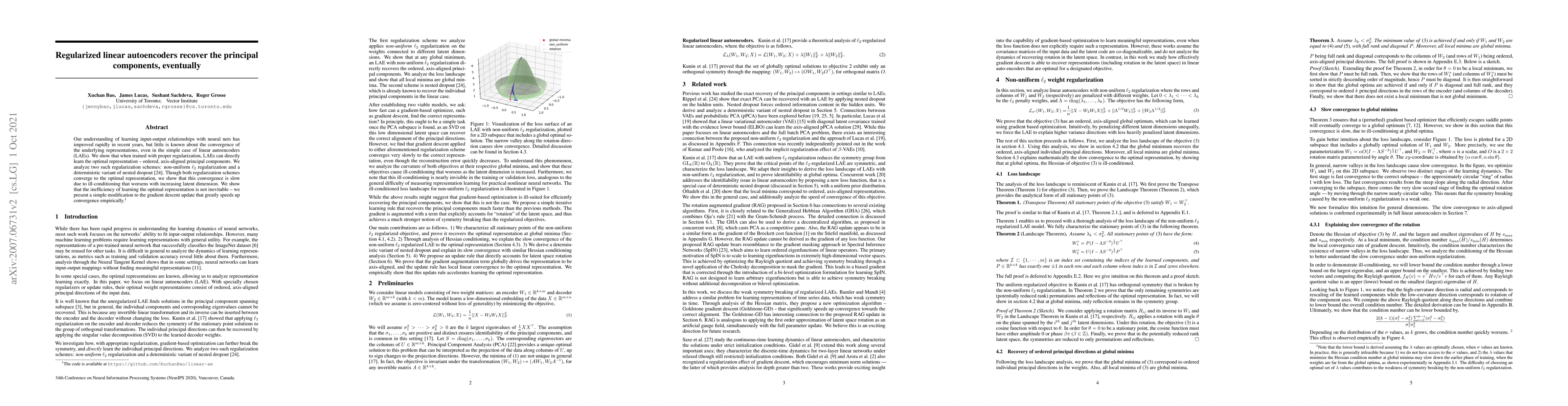Linear autoencoders can learn optimal principal components with proper regularization, but convergence is slow due to ill-conditioning. A modification to gradient descent speeds up convergence empirically.