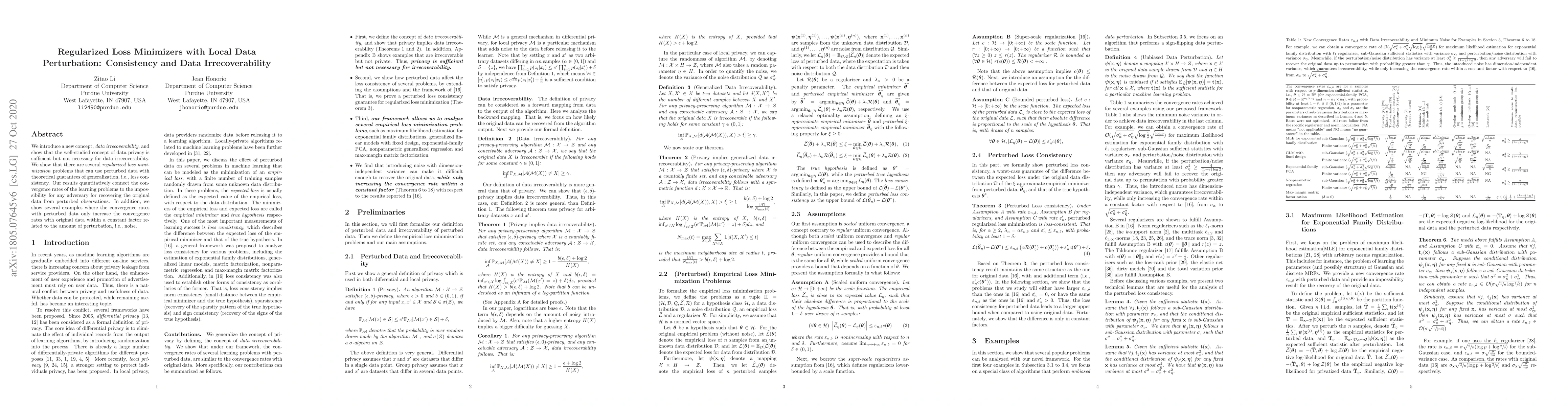 We introduce a new concept, data irrecoverability, and show that the well-studied concept of data privacy is sufficient but not necessary for data irrecoverability. We show that there are several regularized loss minimization problems that can use perturbed data with theoretical guarantees of generalization, i.e., loss consistency. Our results quantitatively connect the convergence rates of the learning problems to the impossibility for any adversary for recovering the original data from perturbed observations. In addition, we show several examples where the convergence rates with perturbed data only increase the convergence rates with original data within a constant factor related to the amount of perturbation, i.e., noise.