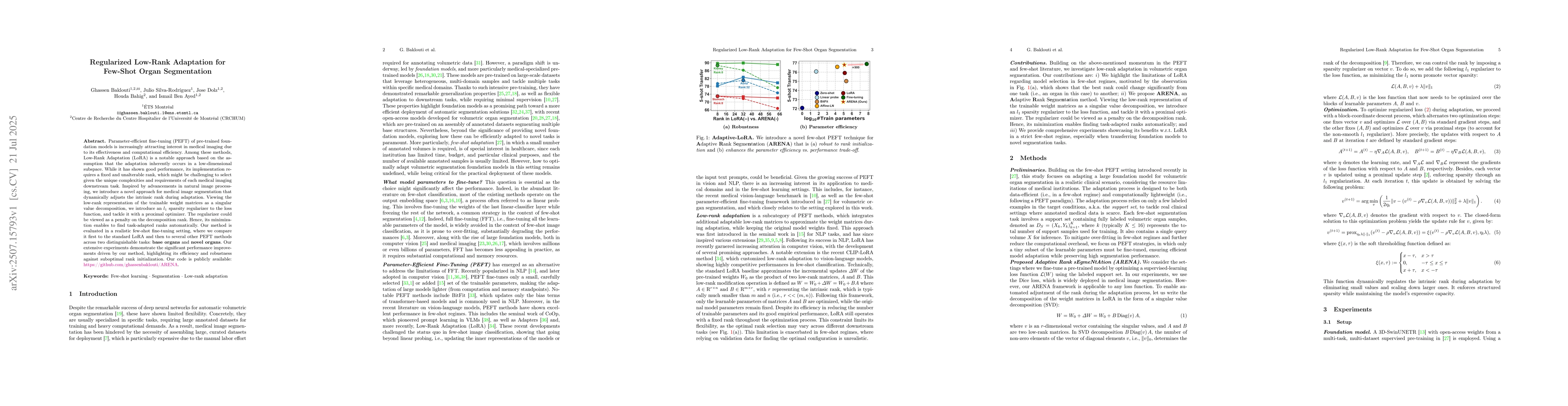 This paper proposes a novel method for few-shot organ segmentation in medical imaging, dynamically adjusting the rank in Low-Rank Adaptation (LoRA) using an l_1 sparsity regularizer. The approach outperforms standard LoRA and other PEFT methods in few-shot fine-tuning settings for both base and novel organ tasks, demonstrating efficiency and robustness.