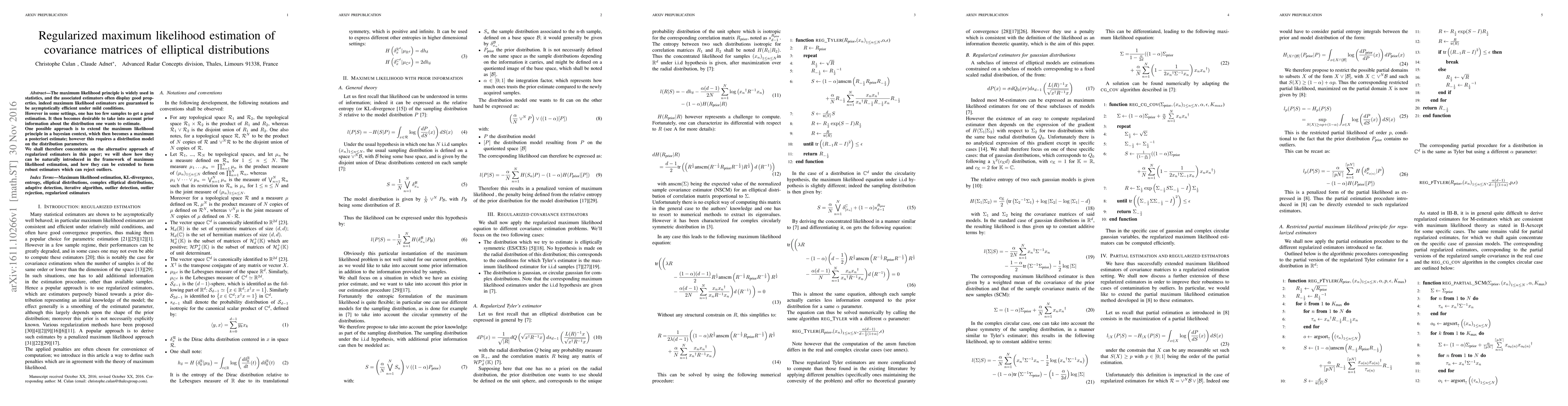 This paper explores regularized maximum likelihood estimation for covariance matrices of elliptical distributions, addressing the challenge of insufficient sample sizes. It proposes a method that incorporates prior information through regularization techniques, offering robust estimators capable of rejecting outliers.