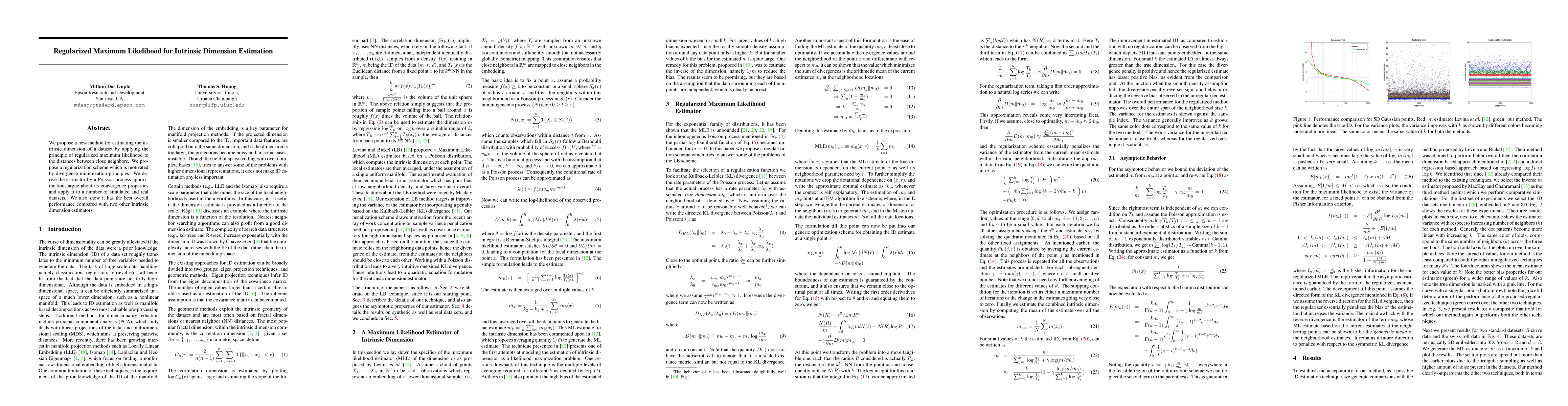 This paper introduces a novel method for estimating the intrinsic dimension of a dataset using regularized maximum likelihood and a regularization scheme based on divergence minimization. The proposed method outperforms other intrinsic dimension estimators on both simulated and real datasets.