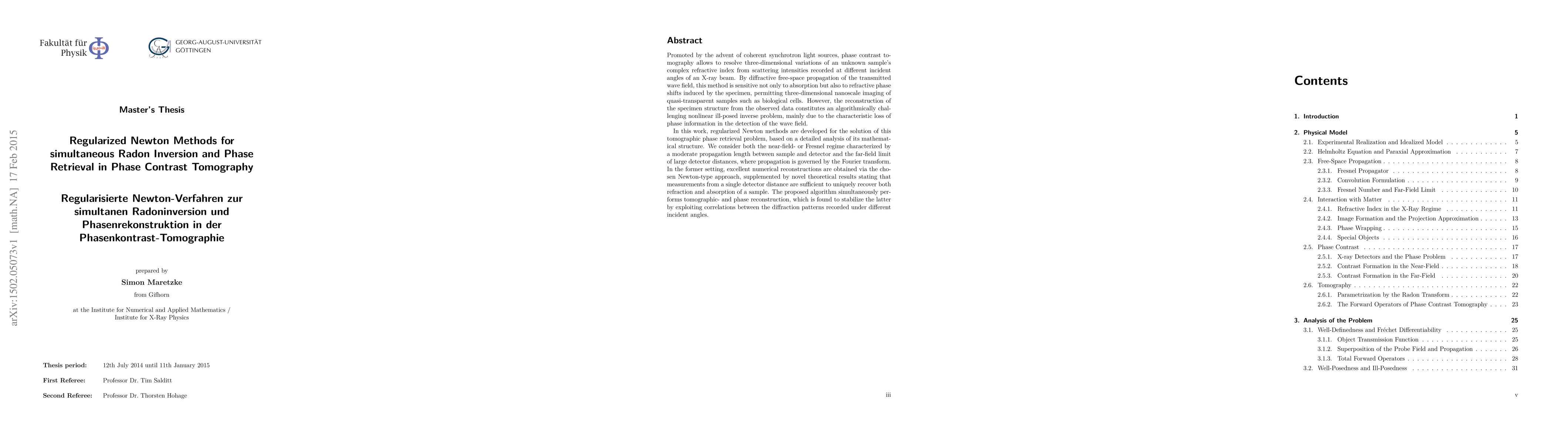 This paper develops regularized Newton methods for solving the challenging inverse problem in phase contrast tomography, enabling the reconstruction of three-dimensional refractive index variations from X-ray scattering data. The proposed approach effectively handles both near-field and far-field regimes, providing stable and accurate reconstructions by leveraging correlations between diffraction patterns.