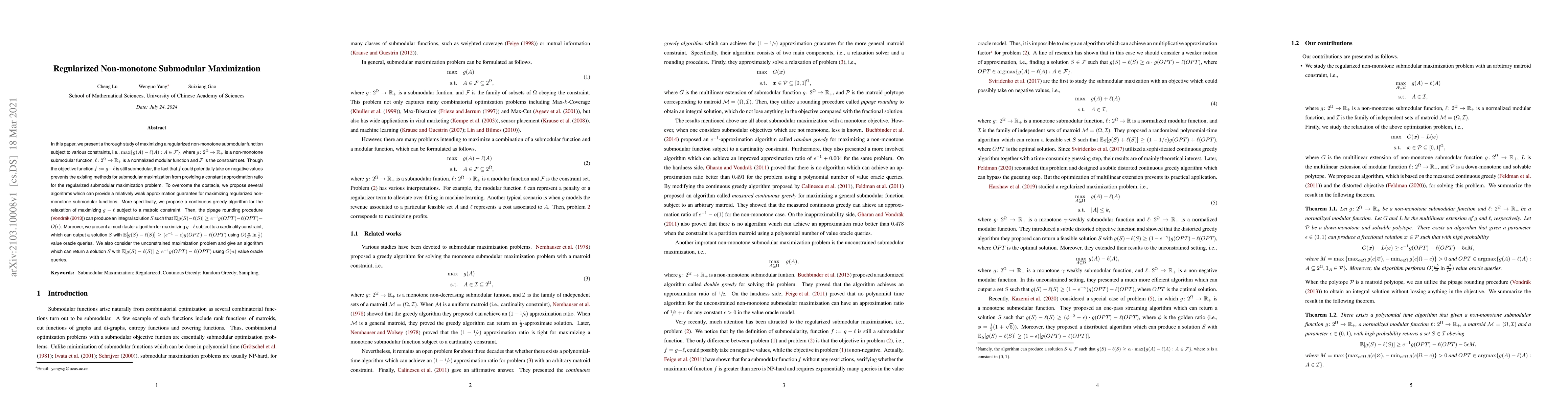 This paper proposes algorithms for maximizing a regularized non-monotone submodular function subject to constraints, addressing the challenge that existing methods cannot guarantee a constant approximation ratio due to potential negative values. It presents continuous greedy and pipage rounding algorithms for matroid constraints, a faster algorithm for cardinality constraints, and an efficient algorithm for the unconstrained case.