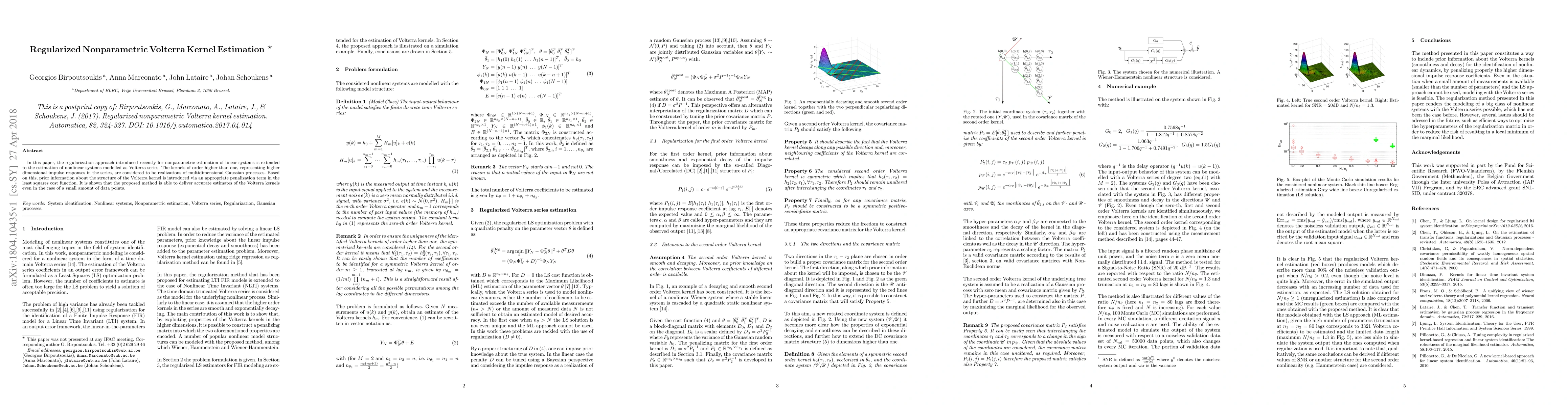 This paper extends regularization techniques for nonparametric estimation to nonlinear systems modeled as Volterra series, introducing prior information via a penalization term in the least squares cost function. The method effectively estimates higher-dimensional Volterra kernels accurately even with limited data.