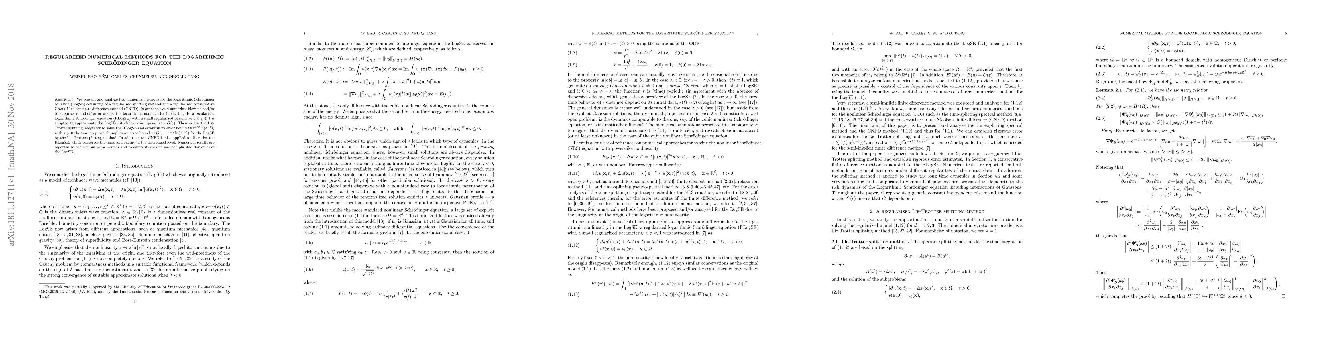 This paper proposes two numerical methods for solving the logarithmic Schrödinger equation, utilizing a regularized version to avoid numerical blow-up and round-off errors. The methods include a regularized splitting method and a conservative Crank-Nicolson finite difference method, both showing linear convergence and conserving mass and energy.
