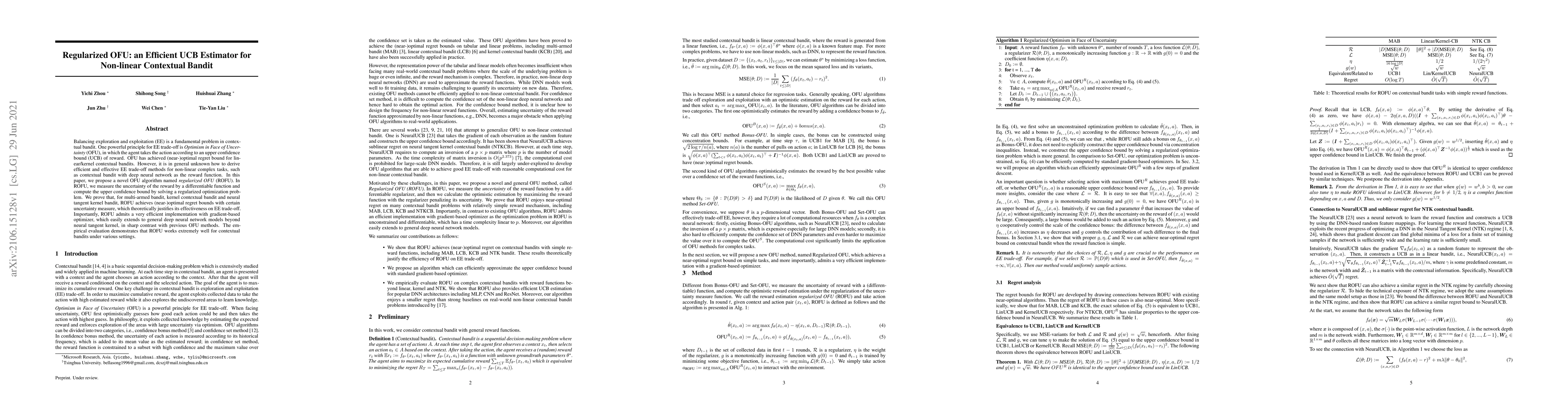 Balancing exploration and exploitation (EE) is a fundamental problem in contex-tual bandit. One powerful principle for EE trade-off isOptimism in Face of Uncer-tainty(OFU), in which the agent takes the action according to an upper confidencebound (UCB) of reward. OFU has achieved (near-)optimal regret bound for lin-ear/kernel contextual bandits. However, it is in general unknown how to deriveefficient and effective EE trade-off methods for non-linearcomplex tasks, suchas contextual bandit with deep neural network as the reward function. In thispaper, we propose a novel OFU algorithm namedregularized OFU(ROFU). InROFU, we measure the uncertainty of the reward by a differentiable function andcompute the upper confidence bound by solving a regularized optimization prob-lem. We prove that, for multi-armed bandit, kernel contextual bandit and neuraltangent kernel bandit, ROFU achieves (near-)optimal regret bounds with certainuncertainty measure, which theoretically justifies its effectiveness on EE trade-off.Importantly, ROFU admits a very efficient implementation with gradient-basedoptimizer, which easily extends to general deep neural network models beyondneural tangent kernel, in sharp contrast with previous OFU methods. The em-pirical evaluation demonstrates that ROFU works extremelywell for contextualbandits under various settings.