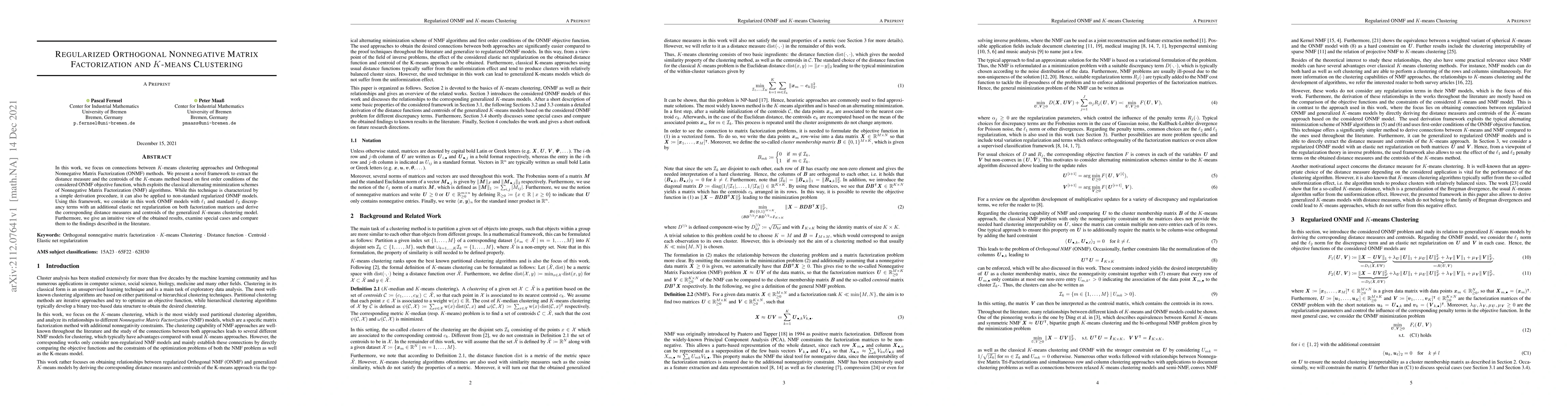 This paper explores the relationship between $K$-means clustering and Orthogonal Nonnegative Matrix Factorization (ONMF) by introducing a framework to derive $K$-means distance measures and centroids from ONMF optimization. It extends this framework to regularized ONMF models, including $\ell_1$ and $\ell_2$ terms, and elastic net regularization, and compares the results with existing literature.