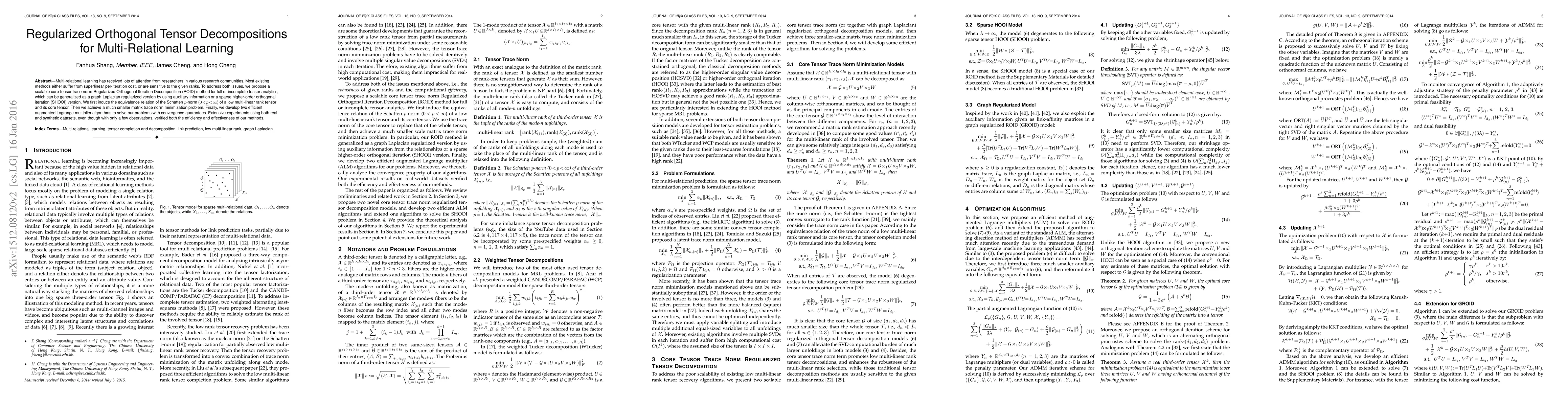 Multi-relational learning has received lots of attention from researchers in various research communities. Most existing methods either suffer from superlinear per-iteration cost, or are sensitive to the given ranks. To address both issues, we propose a scalable core tensor trace norm Regularized Orthogonal Iteration Decomposition (ROID) method for full or incomplete tensor analytics, which can be generalized as a graph Laplacian regularized version by using auxiliary information or a sparse higher-order orthogonal iteration (SHOOI) version. We first induce the equivalence relation of the Schatten p-norm (0