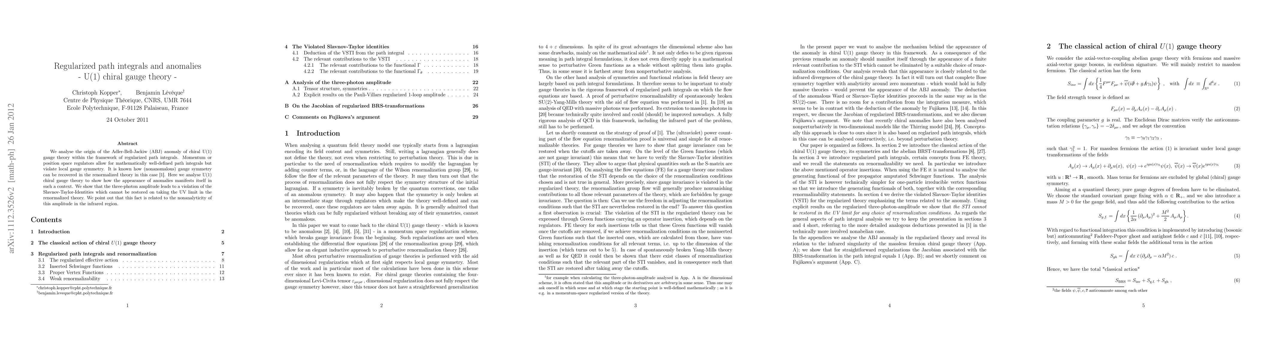 This paper explores the Adler anomaly in chiral U(1) gauge theory using regularized path integrals, demonstrating that the three-photon amplitude violates Slavnov-Taylor Identities in the infrared region, indicating a persistent anomaly even after renormalization.
