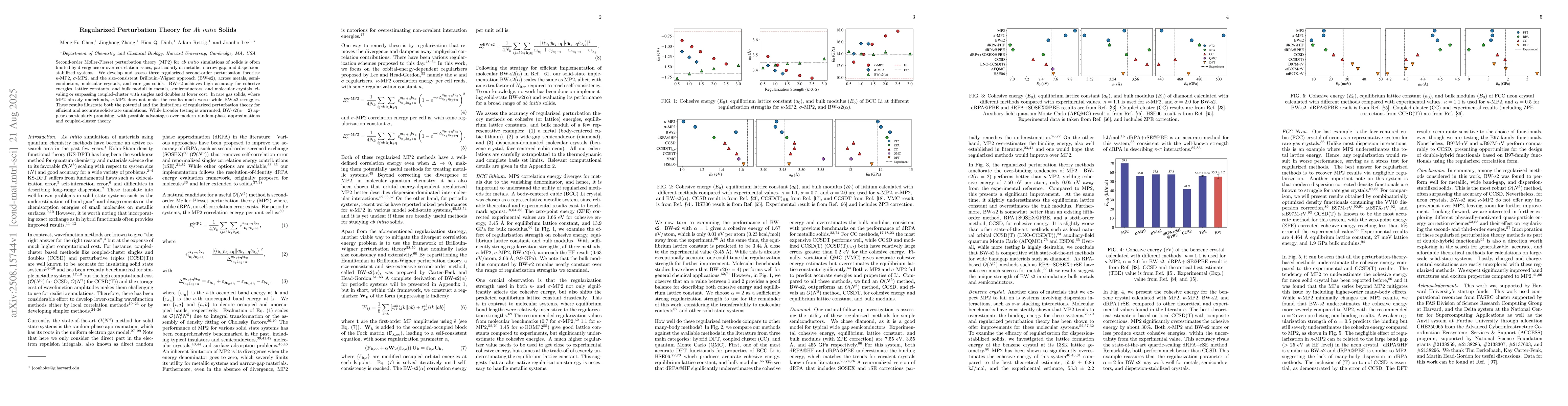Second-order Moller-Plesset perturbation theory (MP2) for ab initio simulations of solids is often limited by divergence or over-correlation issues, particularly in metallic, narrow-gap, and dispersion-stabilized systems. We develop and assess three regularized second-order perturbation theories: $\kappa$-MP2, $\sigma$-MP2, and the size-consistent Brillouin-Wigner approach (BW-s2), across metals, semiconductors, molecular crystals, and rare gas solids. BW-s2 achieves high accuracy for cohesive energies, lattice constants, and bulk moduli in metals, semiconductors, and molecular crystals, rivaling or surpassing coupled-cluster with singles and doubles at lower cost. In rare gas solids, where MP2 already underbinds, $\kappa$-MP2 does not make the results much worse while BW-s2 struggles. These results illustrate both the potential and the limitations of regularized perturbation theory for efficient and accurate solid-state simulations. While broader testing is warranted, BW-s2($\alpha$ = 2) appears particularly promising, with possible advantages over modern random-phase approximations and coupled-cluster theory.