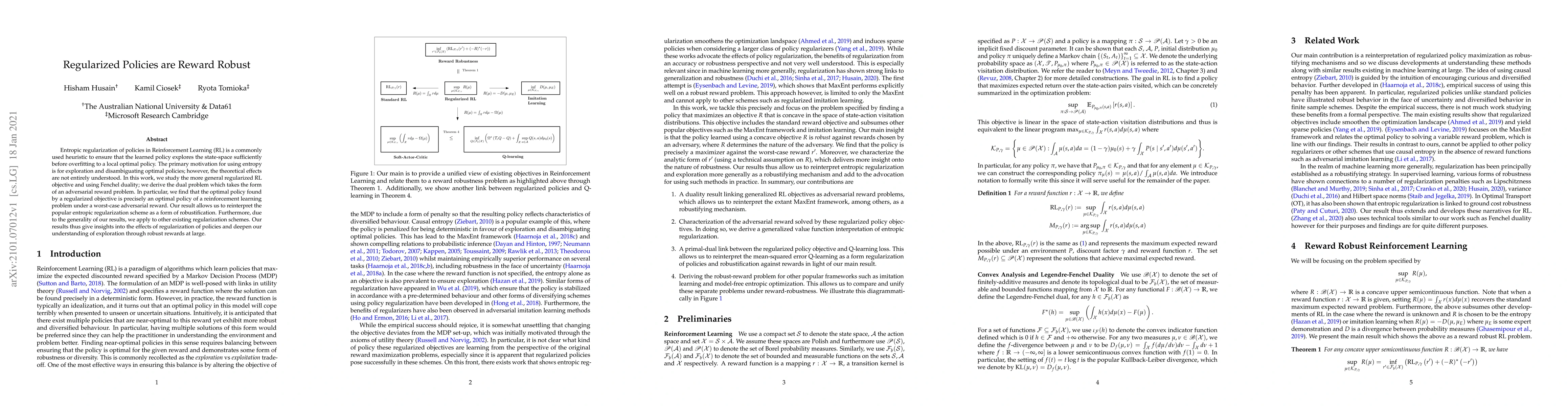Entropic regularization of policies in Reinforcement Learning (RL) is a commonly used heuristic to ensure that the learned policy explores the state-space sufficiently before overfitting to a local optimal policy. The primary motivation for using entropy is for exploration and disambiguating optimal policies; however, the theoretical effects are not entirely understood. In this work, we study the more general regularized RL objective and using Fenchel duality; we derive the dual problem which takes the form of an adversarial reward problem. In particular, we find that the optimal policy found by a regularized objective is precisely an optimal policy of a reinforcement learning problem under a worst-case adversarial reward. Our result allows us to reinterpret the popular entropic regularization scheme as a form of robustification. Furthermore, due to the generality of our results, we apply to other existing regularization schemes. Our results thus give insights into the effects of regularization of policies and deepen our understanding of exploration through robust rewards at large.