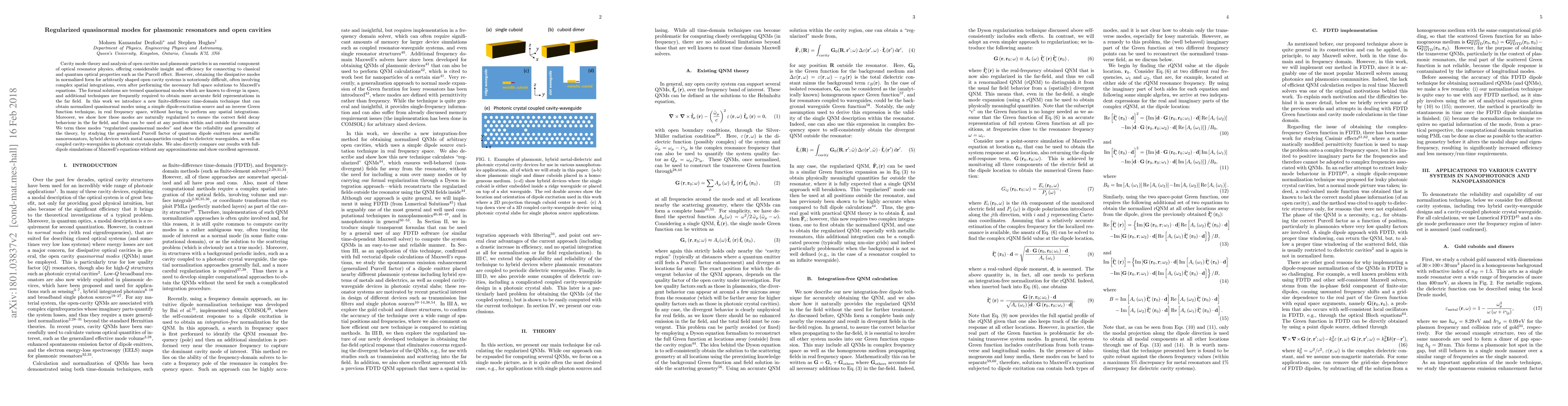 Cavity mode theory and analysis of open cavities and plasmonic particles is an essential component of optical resonator physics, offering considerable insight and efficiency for connecting to classical and quantum optical properties such as the Purcell effect. However, obtaining the dissipative modes in normalized form for arbitrarily shaped open cavity systems is notoriously difficult, often involving complex spatial integrations, even after performing the necessary full space solutions to Maxwell's equations. The formal solutions are termed quasinormal modes which are known to diverge in space, and additional techniques are frequently required to obtain more accurate field representations in the far field. In this work we introduce a new finite-difference time-domain technique that can obtain normalized quasinormal modes using a simple dipole-excitation source and an inverse Green function technique, in real frequency space, without having to perform any spatial integrations. Moreover, we show how these modes are naturally regularized to ensure the correct field decay behaviour in the far field, and thus can be used at any position within and outside the resonator. We term these modes "regularized quasinormal modes" and show the reliability and generality of the theory, by studying the generalized Purcell factor of quantum dipole emitters near metallic nanoresonators, hybrid devices with metal nanoparticles coupled to dielectric waveguides, as well as coupled cavity-waveguides in photonic crystals slabs. We also directly compare our results with full-dipole simulations of Maxwell's equations without any approximations and show excellent agreement.