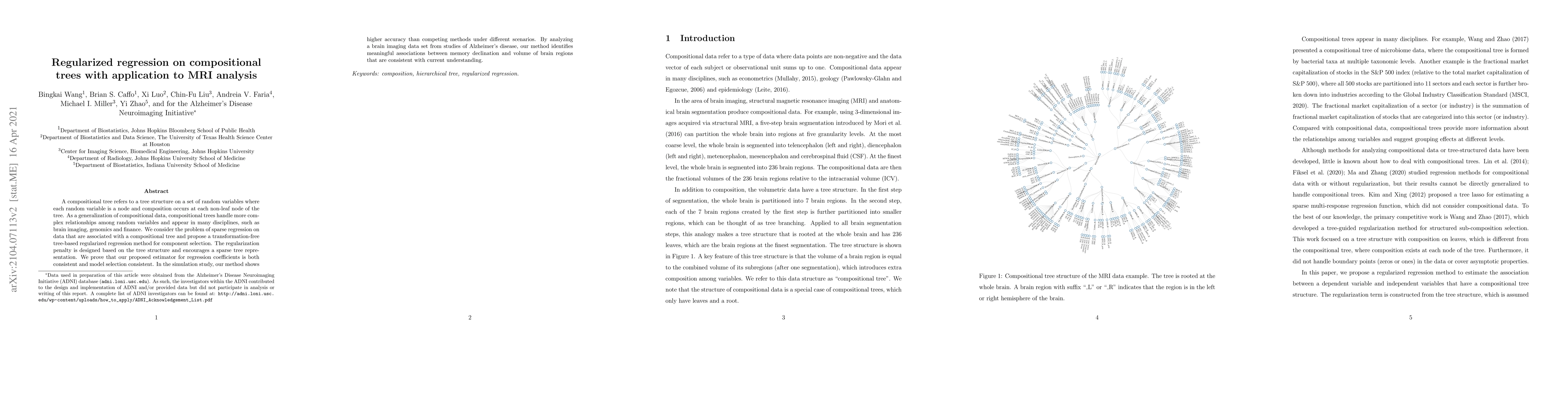 This paper proposes a tree-based regularized regression method for sparse component selection in compositional tree data, demonstrating its effectiveness through simulations and its application in identifying associations in brain imaging data related to Alzheimer's disease. The method is both consistent and model selection consistent, outperforming competing methods.
